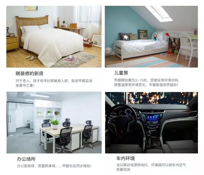 環(huán)境貓小巧便攜,插電即用,與充電寶配套靈活使用,多種場(chǎng)合實(shí)時(shí)監(jiān)測(cè),特別適用于剛裝修的新房、兒童房、辦公場(chǎng)所、車內(nèi)環(huán)境等。