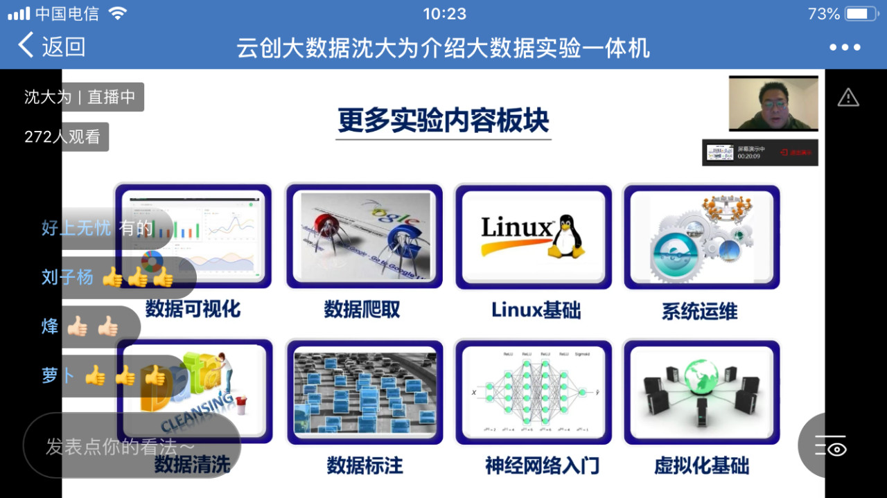 接著,云創(chuàng)大數(shù)據(jù)外聯(lián)負(fù)責(zé)人沈大為、曹騮總監(jiān)、謝超工程師則依次帶來了大數(shù)據(jù)實驗平臺、人工智能實驗平臺以及云計算實訓(xùn)平臺的介紹和演示。三位就實驗(實訓(xùn))平臺的特性、功能、優(yōu)勢、操作等,進(jìn)行了詳細(xì)的分享。
