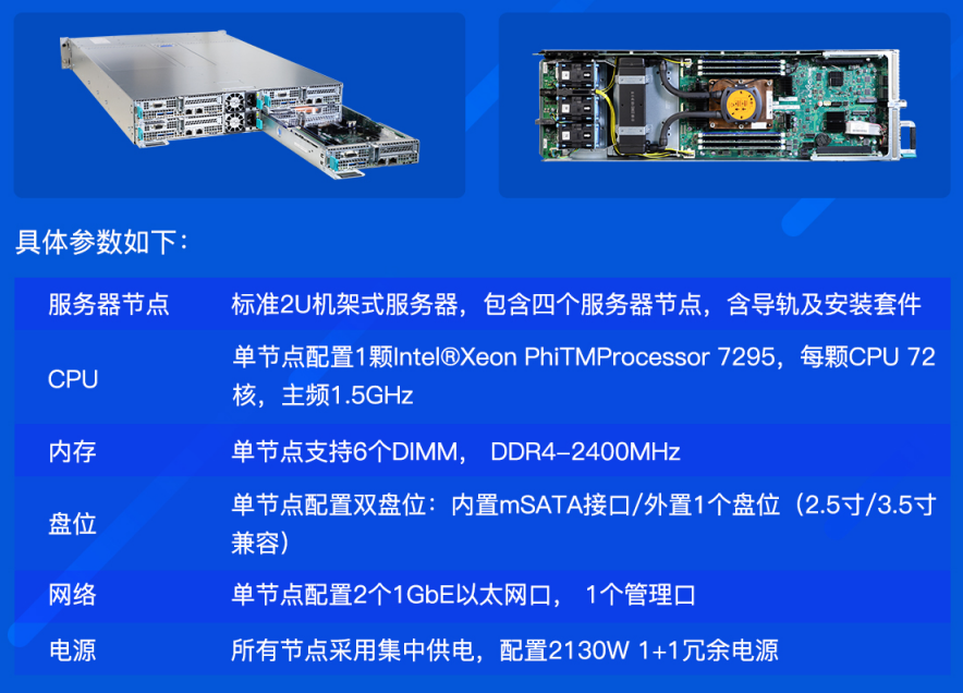 四子星服務(wù)器是基于Intel處理器開發(fā)的標(biāo)準(zhǔn)2U機架式服務(wù)器,配置4顆英特爾?至強融核?處理器,每個CPU內(nèi)核多達72個,能夠提供穩(wěn)定、安全的計算力保證,具體參數(shù)如下: