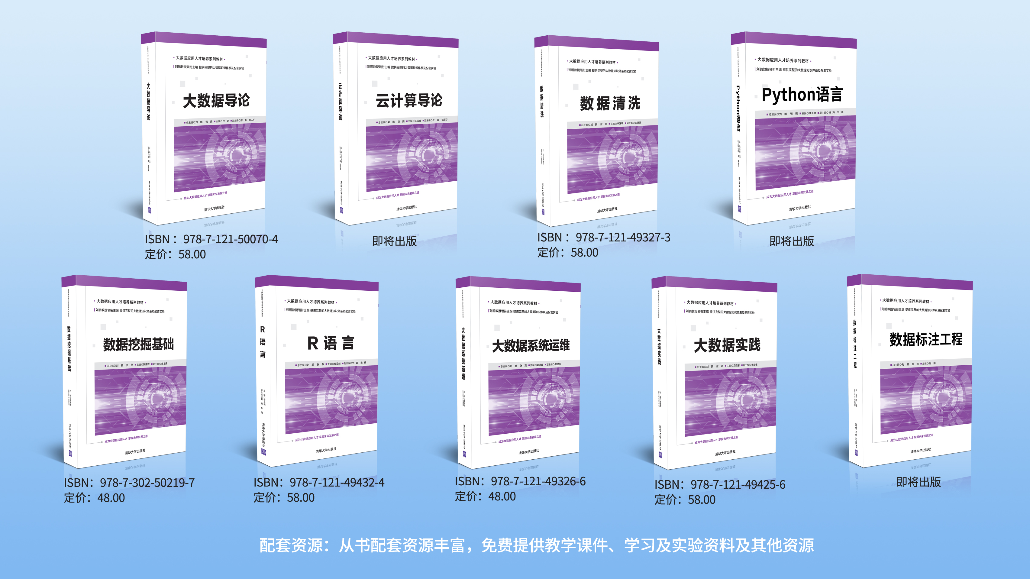 在“高級大數(shù)據(jù)人才培養(yǎng)叢書”之外,同樣出自云創(chuàng)大數(shù)據(jù)團隊的“大數(shù)據(jù)應用人才培養(yǎng)系列教材”已由清華大學出版社出版,內容覆蓋大數(shù)據(jù)導論、數(shù)據(jù)清洗、Python語言、R語言、大數(shù)據(jù)實踐等豐富內容,可作為全國高職院校大數(shù)據(jù)專業(yè)叢書。