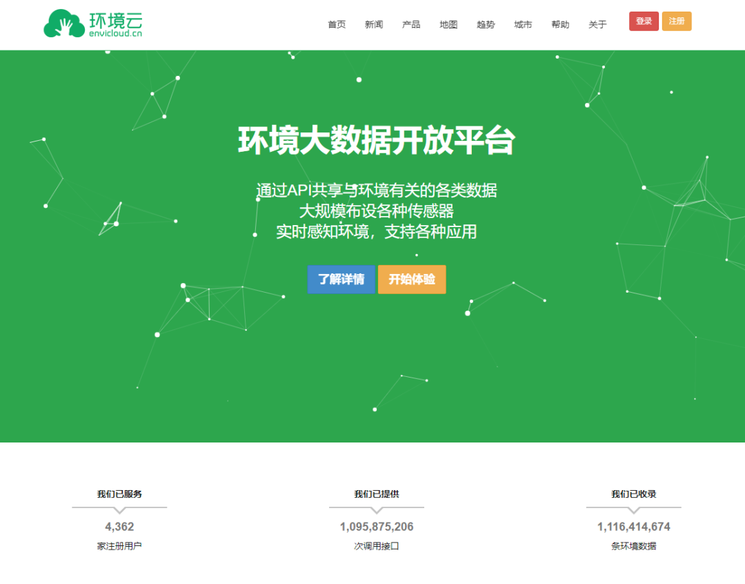 環(huán)境云可為環(huán)境應用開發(fā)者提供豐富可靠的氣象、環(huán)境、災害以及地理數(shù)據(jù)服務。此外,環(huán)境云還為環(huán)境研究人員提供了歷史數(shù)據(jù)報表下載,并向公眾展示環(huán)境實況。目前,環(huán)境云已服務4300余家注冊用戶,已收錄11億余條環(huán)境數(shù)據(jù)。