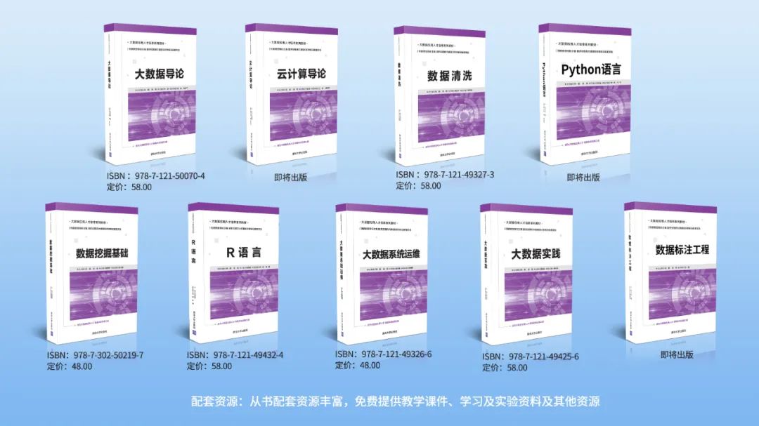 同樣出自云創(chuàng)大數(shù)據(jù)團(tuán)隊(duì)的“大數(shù)據(jù)應(yīng)用人才培養(yǎng)系列教材”已由清華大學(xué)出版社出版,內(nèi)容覆蓋大數(shù)據(jù)導(dǎo)論、數(shù)據(jù)清洗、Python語(yǔ)言、R語(yǔ)言、大數(shù)據(jù)實(shí)踐等豐富內(nèi)容,可作為全國(guó)高職院校大數(shù)據(jù)專(zhuān)業(yè)叢書(shū)。