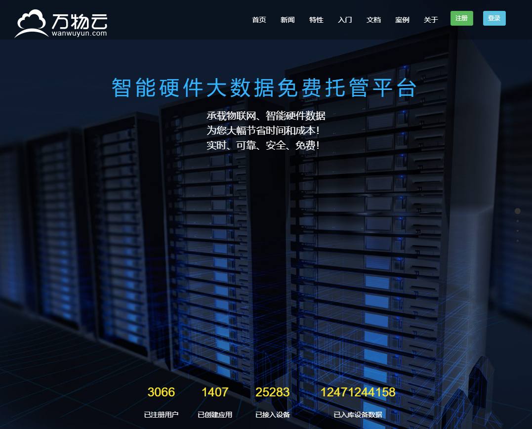萬(wàn)物云是一個(gè)免費(fèi)的物聯(lián)網(wǎng)設(shè)備和應(yīng)用的數(shù)據(jù)托管平臺(tái),可提供簡(jiǎn)單易用的物聯(lián)網(wǎng)與智能硬件數(shù)據(jù)接入、存儲(chǔ)和處理以及數(shù)據(jù)應(yīng)用等一站式數(shù)據(jù)托管服務(wù),在大幅度縮短開(kāi)發(fā)周期、降低研發(fā)和營(yíng)運(yùn)成本的同時(shí),將打造一個(gè)萬(wàn)物互聯(lián)的世界。目前,萬(wàn)物云已注冊(cè)3000余家用戶(hù),已入庫(kù)設(shè)備數(shù)據(jù)124億余條。