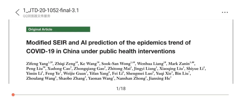 闡述第一版預(yù)測(cè)內(nèi)容的論文《基于SEIR優(yōu)化模型和AI對(duì)公共衛(wèi)生干預(yù)下的中國(guó)COVID-19暴發(fā)趨勢(shì)預(yù)測(cè)》在《Journal of Thoracic Disease》(《胸部疾病雜志》)上正式發(fā)表。其中,云創(chuàng)大數(shù)據(jù)總裁劉鵬教授作為并列第一作者。該文章提出了基于大數(shù)據(jù)的改進(jìn)SEIR預(yù)測(cè)模型,并提出了數(shù)據(jù)受限條件下的人工智能LSTM預(yù)測(cè)方法。