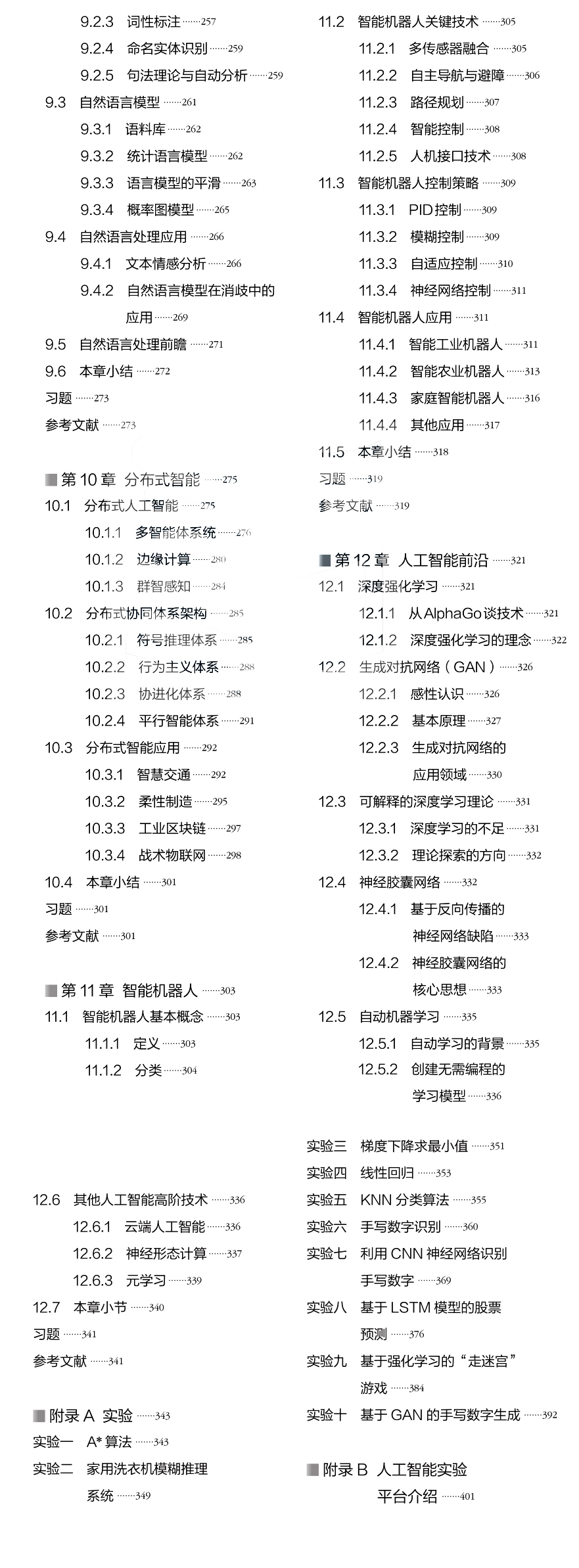 該教材前6個章節(jié)對以前的人工智能內(nèi)容作了重新梳理,主要講解一些經(jīng)典的人工智能知識;作為全新內(nèi)容的后6個章節(jié)則對國內(nèi)外近4年人工智能研究領(lǐng)域的新進展和新成果進行了重點講解。考慮到本書內(nèi)容較多,授課老師也可根據(jù)教學(xué)實際,挑選相關(guān)內(nèi)容進行教學(xué)。