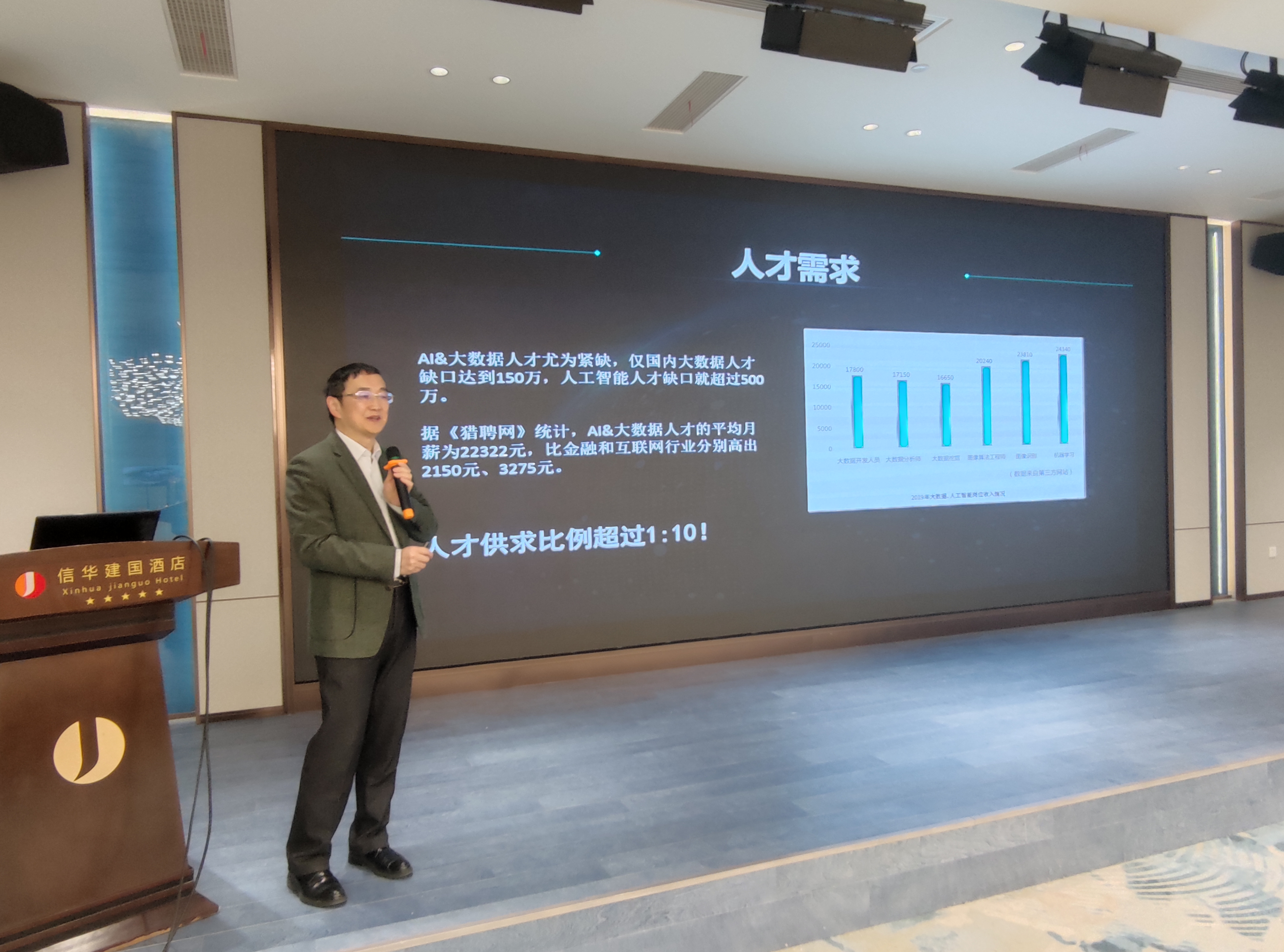 12月19日上午,在主題報(bào)告環(huán)節(jié),清華大學(xué)博士、南京大數(shù)據(jù)研究院院長(zhǎng)、中國(guó)大數(shù)據(jù)應(yīng)用聯(lián)盟人工智能專家委員會(huì)主任、中國(guó)信息協(xié)會(huì)教育分會(huì)人工智能教育專家委員會(huì)主任、云創(chuàng)大數(shù)據(jù)總裁劉鵬教授受邀作了題為“高職高專大數(shù)據(jù)和人工智能人才培養(yǎng)”的報(bào)告。