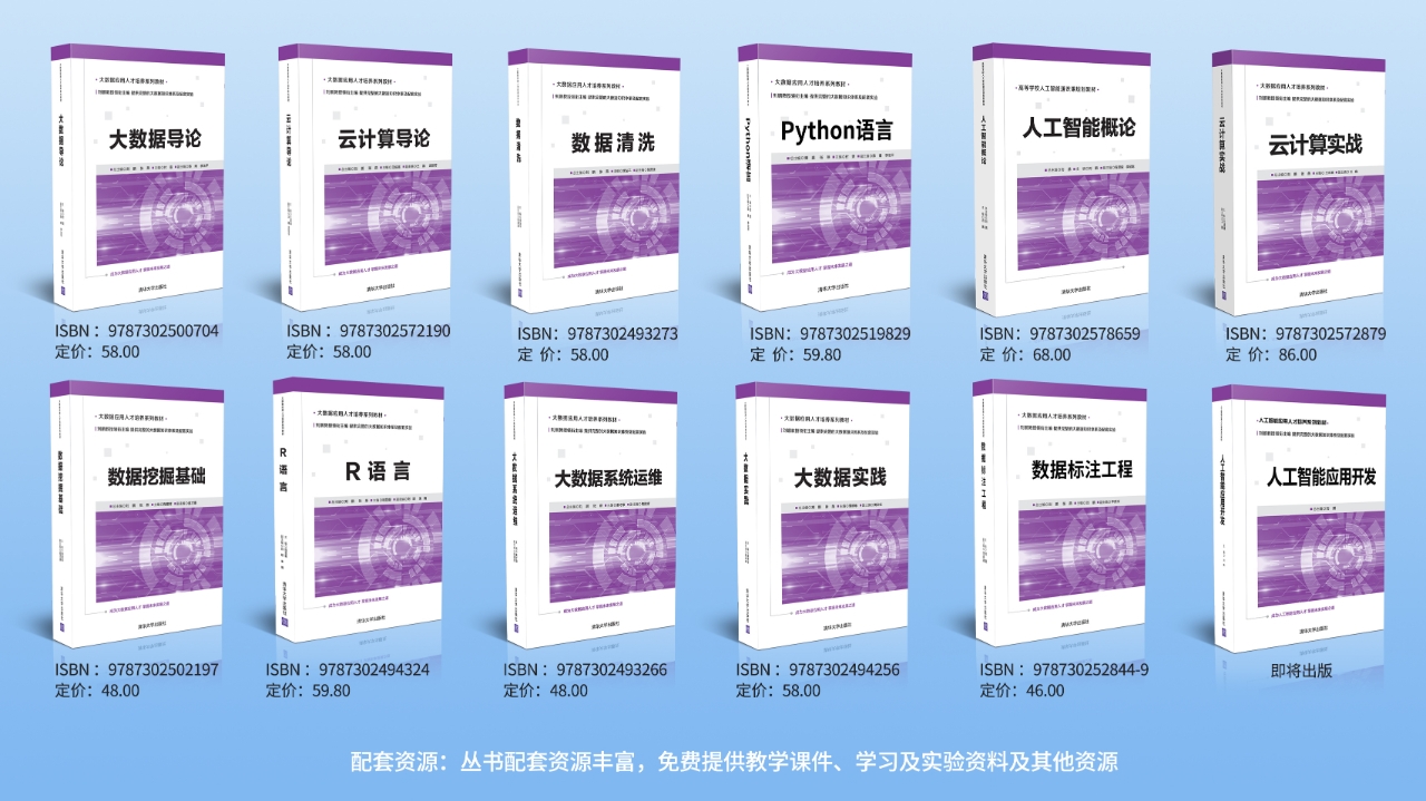 具體而言,叢書包含《人工智能概論》、《云計算導論》、《云計算實戰(zhàn)》、《大數(shù)據(jù)導論》、《數(shù)據(jù)清洗》、《Python語言》、《數(shù)據(jù)挖掘基礎》、《R語言》、《大數(shù)據(jù)系統(tǒng)運維》、《大數(shù)據(jù)實踐》、《數(shù)據(jù)標注工程》、《人工智能應用開發(fā)》。該叢書內(nèi)容側(cè)重于實踐應用,不僅對知識點給出具體的操作步驟,而且有配套的動手實驗。內(nèi)容安排遵循從簡單到復雜、從理論到實踐的學習過程,同時也遵循系統(tǒng)性和覆蓋面寬的原則。