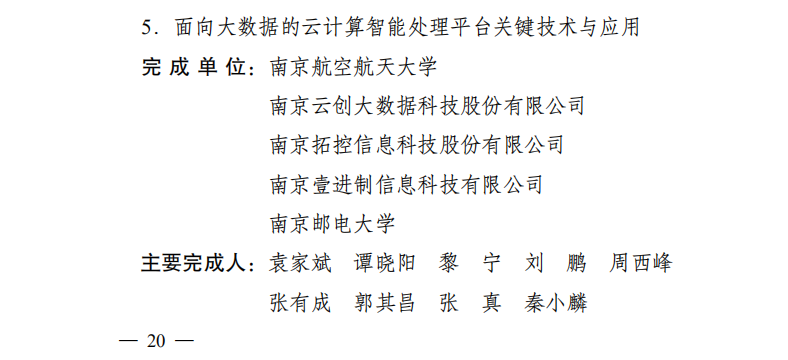 “面向大數(shù)據(jù)的云計算智能處理平臺關(guān)鍵技術(shù)與應(yīng)用”由南京航空航天大學(xué)、南京云創(chuàng)大數(shù)據(jù)科技股份有限公司、南京拓控信息科技股份有限公司、南京壹進(jìn)制信息科技有限公司、南京郵電大學(xué)共同完成。主要完成人員包括云創(chuàng)大數(shù)據(jù)總裁劉鵬教授和張真董事長等9位行業(yè)專家。該項成果的研發(fā)和獲獎,展現(xiàn)出云創(chuàng)大數(shù)據(jù)等單位雄厚的研發(fā)實力和前沿的創(chuàng)新技術(shù)。?