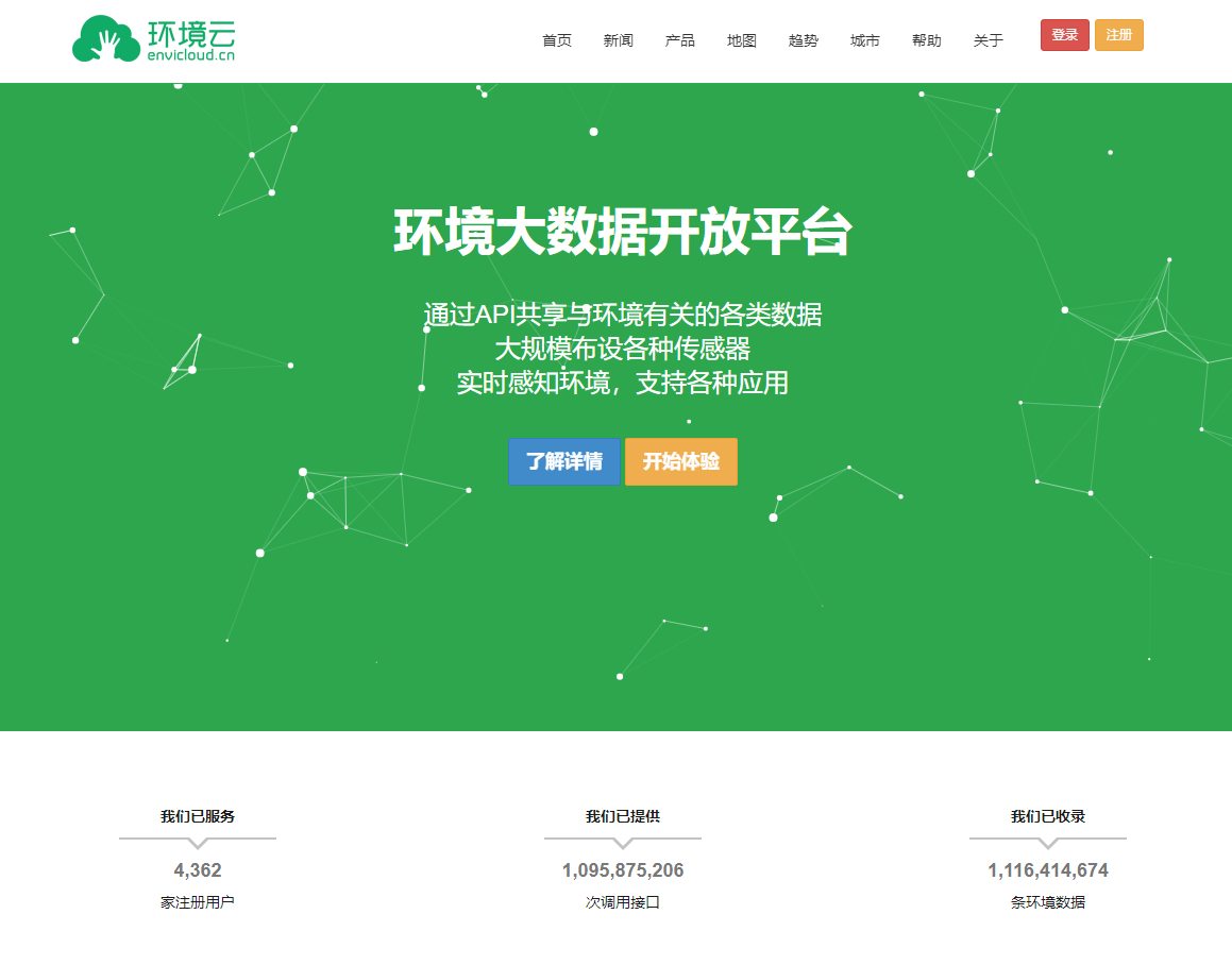 作為環(huán)境大數(shù)據(jù)開放平臺,環(huán)境云通過大規(guī)模部建各類環(huán)境監(jiān)測傳感器采集數(shù)據(jù),同時集成第三方專業(yè)數(shù)據(jù)源發(fā)布的數(shù)據(jù),結(jié)合相關(guān)數(shù)據(jù)預測模型生成的預報數(shù)據(jù),依托數(shù)據(jù)托管服務平臺——萬物云提供的數(shù)據(jù)存儲服務,配合代碼示例和詳盡的接口使用說明,為環(huán)境應用開發(fā)者提供豐富可靠的氣象、環(huán)境、災害以及地理數(shù)據(jù)服務。此外,環(huán)境云還為環(huán)境研究人員提供了歷史數(shù)據(jù)報表下載,并向公眾展示環(huán)境實況。目前,環(huán)境云已服務4300余家注冊用戶,已收錄11億余條環(huán)境數(shù)據(jù)。