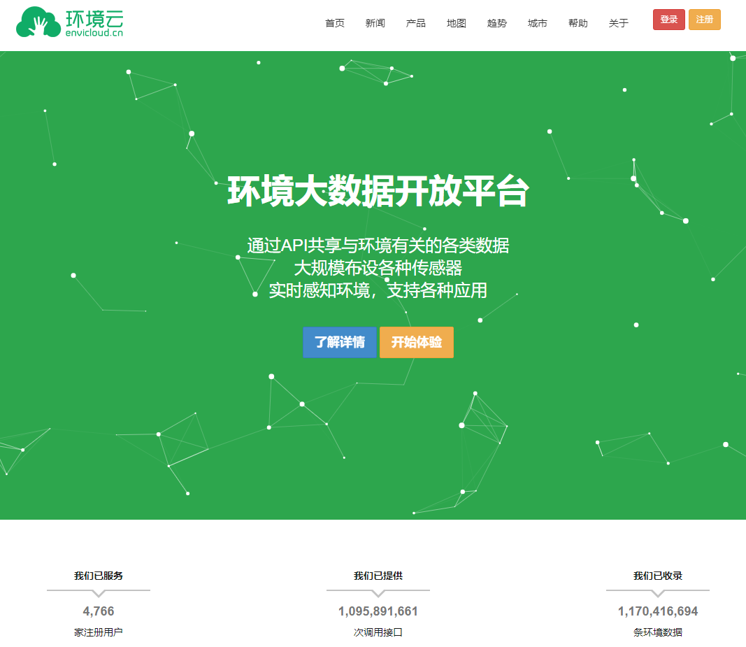 作為環(huán)境大數(shù)據(jù)開放平臺,環(huán)境云通過大規(guī)模部建各類環(huán)境監(jiān)測傳感器采集數(shù)據(jù),同時集成第三方專業(yè)數(shù)據(jù)源發(fā)布的數(shù)據(jù),結(jié)合相關(guān)數(shù)據(jù)預(yù)測模型生成的預(yù)報數(shù)據(jù),依托數(shù)據(jù)托管服務(wù)平臺——萬物云提供的數(shù)據(jù)存儲服務(wù),配合代碼示例和詳盡的接口使用說明,為環(huán)境應(yīng)用開發(fā)者提供豐富可靠的氣象、環(huán)境、災(zāi)害以及地理數(shù)據(jù)服務(wù)。此外,環(huán)境云還為環(huán)境研究人員提供了歷史數(shù)據(jù)報表下載,并向公眾展示環(huán)境實況。目前,環(huán)境云已服務(wù)4700余家注冊用戶,已收錄11億余條環(huán)境數(shù)據(jù)。