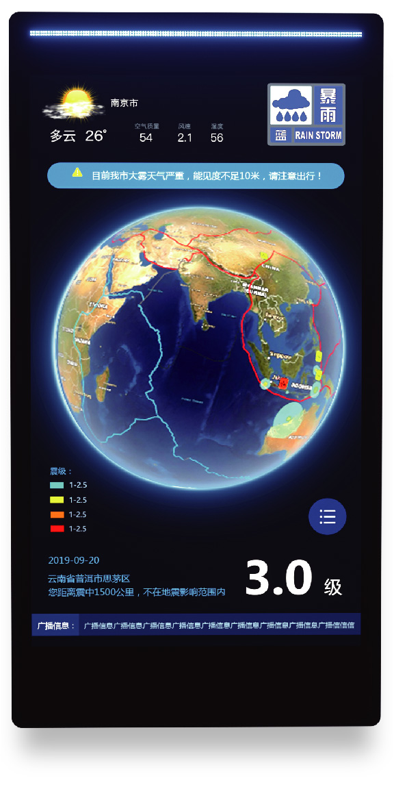 集成了地震預(yù)警、氣象預(yù)警、防洪防汛預(yù)警、地質(zhì)災(zāi)害預(yù)警以及地震烈度速報的應(yīng)急信息發(fā)布終端。通過紅、橙、黃、藍(lán)四色燈光及聲音進行應(yīng)急預(yù)警,并通過內(nèi)置三軸加速度傳感器記錄震時震感數(shù)據(jù)、內(nèi)置高清攝像頭采集地震現(xiàn)場災(zāi)情。還能通過設(shè)備位置、人臉識別實現(xiàn)定點精確推送,提供內(nèi)容發(fā)布、新聞推送、交通實況、生活指數(shù)等諸多智慧服務(wù)功能。
