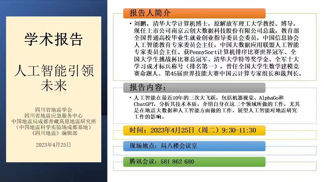 4月25日上午,四川省地震學(xué)會(huì)、四川省地震應(yīng)急服務(wù)中心、中國(guó)地震局成都青藏高原地震研究所(中國(guó)地震科學(xué)實(shí)驗(yàn)場(chǎng)成都基地)、《四川地震》編輯部聯(lián)合舉辦學(xué)術(shù)報(bào)告會(huì),劉鵬教授受邀作主題報(bào)告。本次報(bào)告還通過(guò)騰訊會(huì)議的形式組織進(jìn)行。