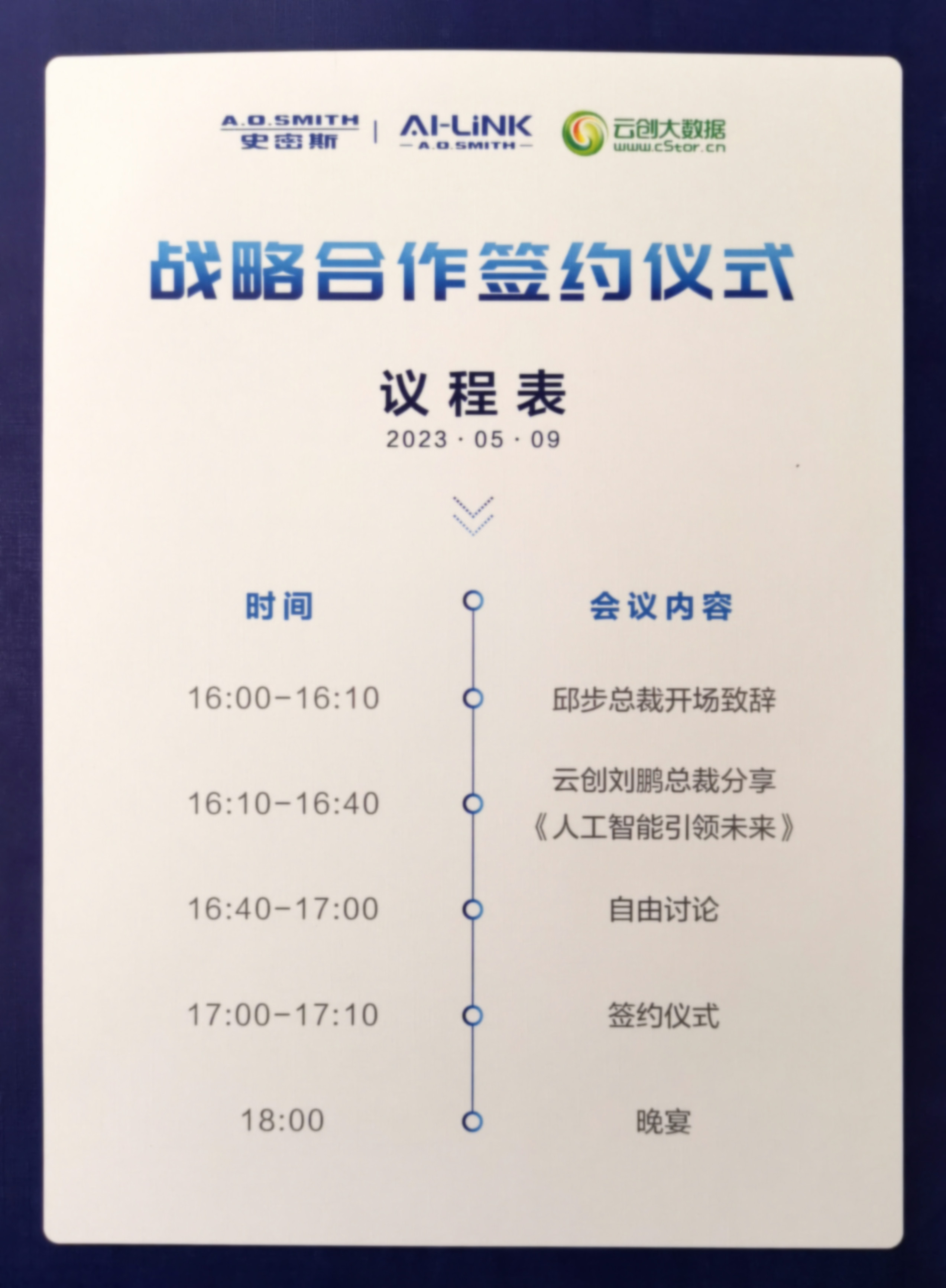 在簽約之前,邱步總裁表達(dá)了A.O.史密斯對(duì)技術(shù)的篤信,明確了雙方品牌理念和業(yè)務(wù)領(lǐng)域的契合,劉鵬總裁表達(dá)了云創(chuàng)大數(shù)據(jù)對(duì)創(chuàng)新的堅(jiān)守,分享了近期人工智能技術(shù)的創(chuàng)新發(fā)展。對(duì)于行業(yè)發(fā)展動(dòng)向以及未來合作事宜,雙方表示深度認(rèn)同,并針對(duì)具體業(yè)務(wù)場(chǎng)景深入探討了合作細(xì)節(jié)。在簽約儀式上,邱步總裁與劉鵬總裁代表雙方簽署了戰(zhàn)略合作協(xié)議。