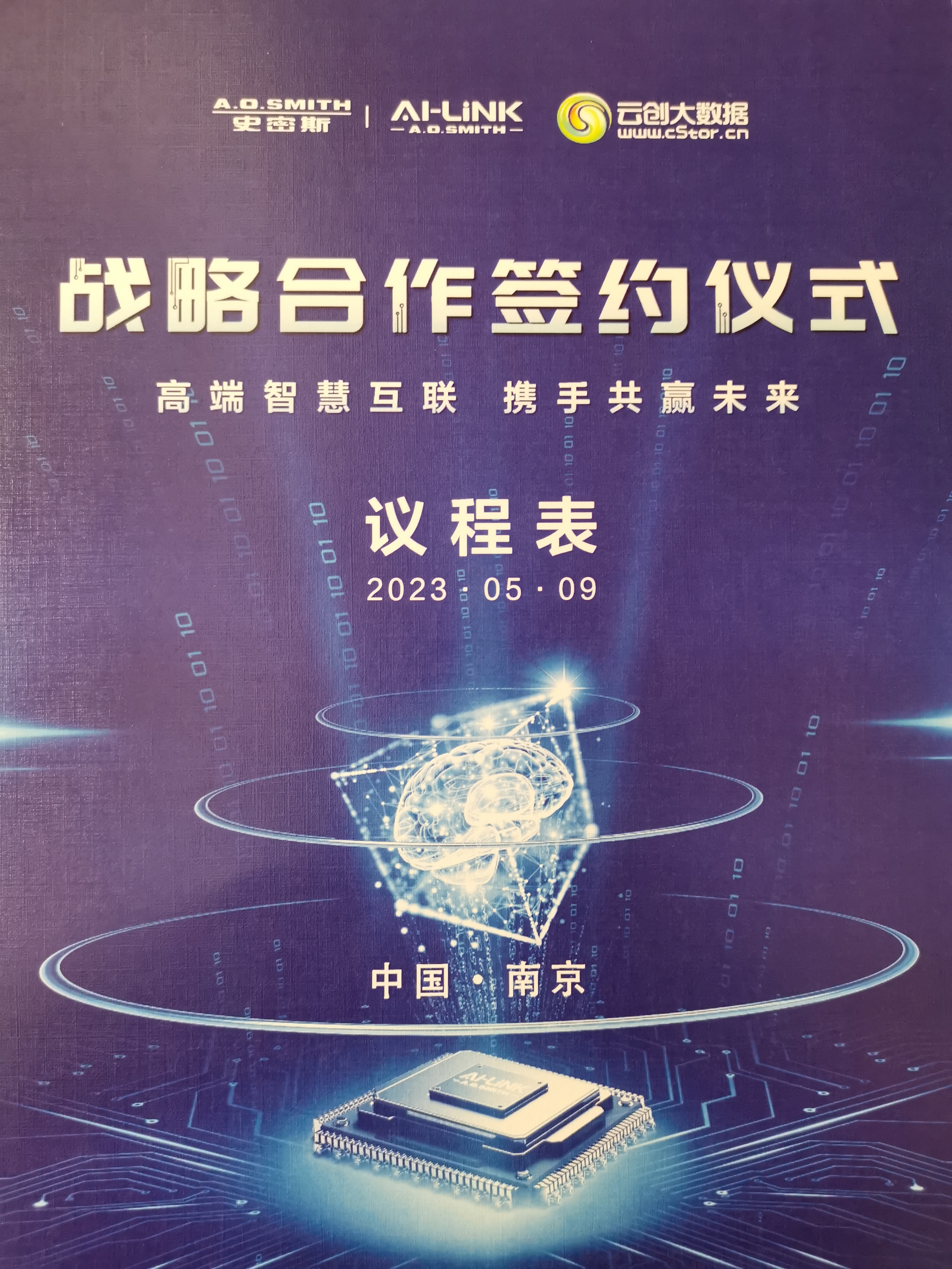 5月9日下午,南京云創(chuàng)大數(shù)據(jù)科技股份有限公司與A.O.史密斯簽署戰(zhàn)略合作協(xié)議。A.O.史密斯高級(jí)副總裁兼中國(guó)公司總裁邱步、產(chǎn)品工程副總裁楊國(guó)斌、首席信息官李新、市場(chǎng)副總經(jīng)理兼商用產(chǎn)品營(yíng)銷總經(jīng)理張暉以及云創(chuàng)大數(shù)據(jù)總裁劉鵬教授、市場(chǎng)部總監(jiān)袁高峰、市場(chǎng)經(jīng)理聞鵬志共同出席了簽約儀式。