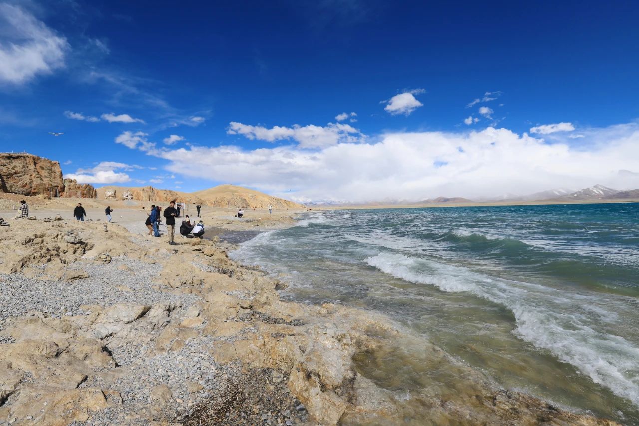 納木措南接終年積雪的念青唐古拉山,廣闊的草原繞湖四周,藍(lán)天凈澈如洗,云朵漂浮低垂,湖水藍(lán)綠如斯,海鷗翱翔嬉戲,人間仙境大抵如此。