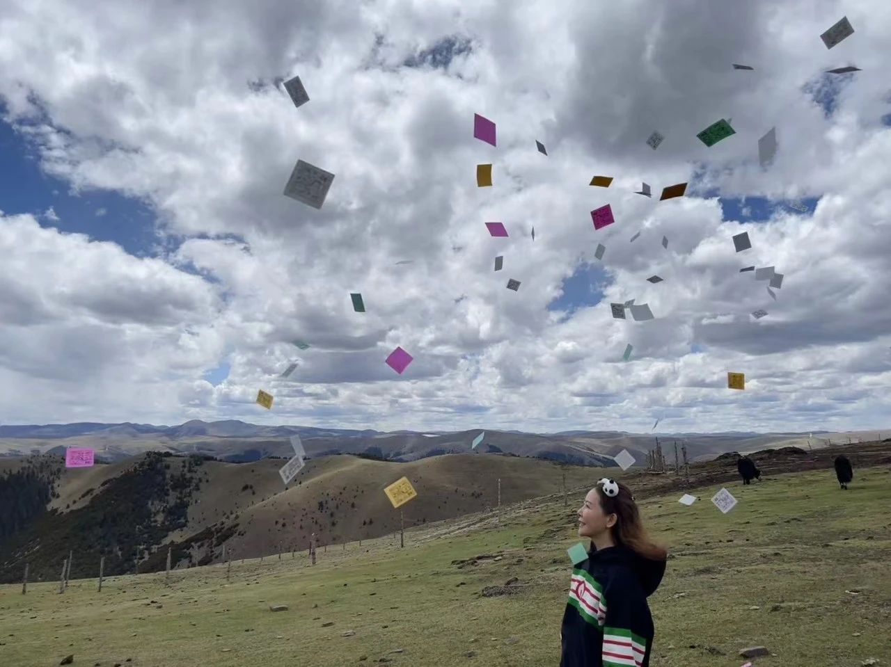 行駛在剪子彎山,也做一回茶馬古道的過客。一路向西,牧草豐盛,一直綿延至理塘。在這里撒下的隆達(dá)(印著經(jīng)文的方塊紙),被路過的風(fēng)帶走,祈禱似乎也被神靈接收。