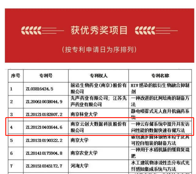 近日,江蘇省人民政府發(fā)布《省政府關(guān)于公布首屆江蘇專利獎的決定》,經(jīng)專利權(quán)人和發(fā)明人申報、專家預(yù)審、信用查詢、社會公示,評選出項目類專利獎。其中,南京云創(chuàng)大數(shù)據(jù)科技股份有限公司(簡稱:云創(chuàng)大數(shù)據(jù))的發(fā)明專利“一種云存儲系統(tǒng)中提升并發(fā)訪問性能的數(shù)據(jù)快速存儲方法”榮獲“江蘇專利獎優(yōu)秀獎”。