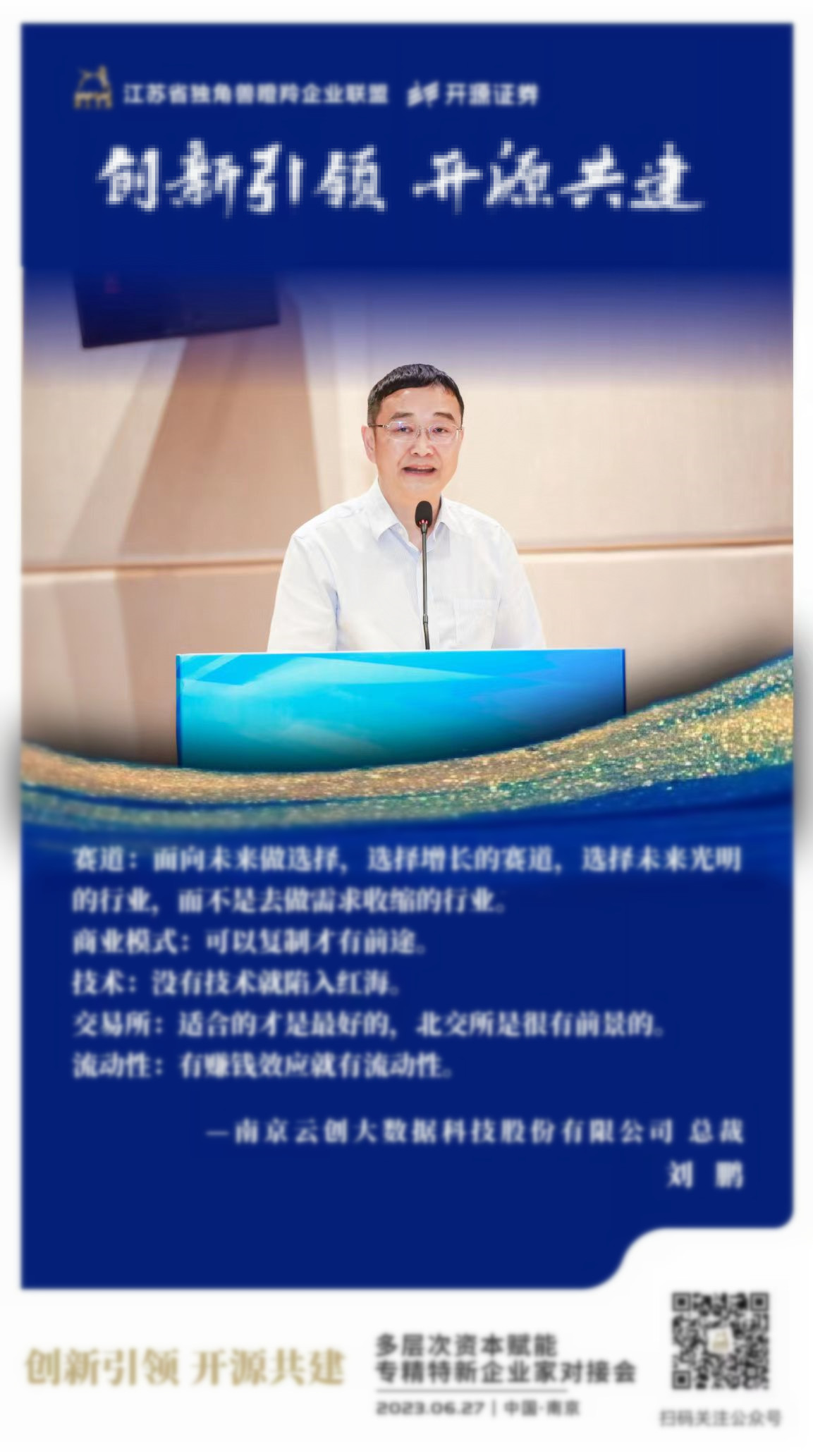 6月27日,“創(chuàng)新引領(lǐng),開(kāi)源共建” ——多層次資本賦能·專精特新企業(yè)家對(duì)接會(huì)在南京舉行?;顒?dòng)邀請(qǐng)到北交所、開(kāi)源證券等資本市場(chǎng)專家,與獨(dú)角獸瞪羚、專精特新企業(yè)家共同探討新三板-北交所新政策和企業(yè)資本市場(chǎng)發(fā)展策略,助力企業(yè)高質(zhì)量發(fā)展。
