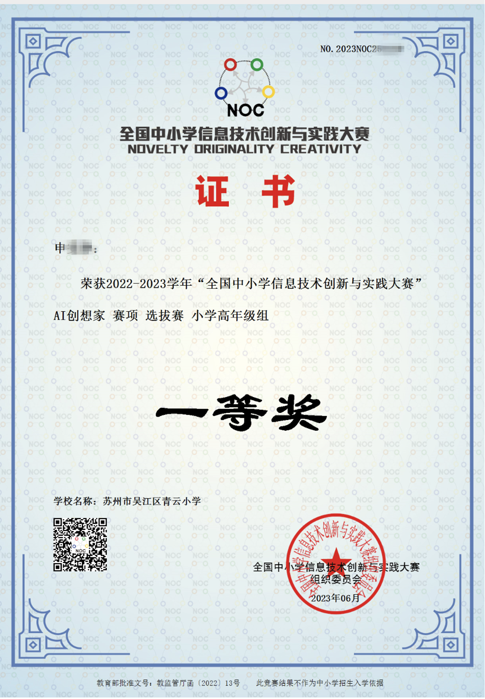 值得關(guān)注的是,“全國(guó)中小學(xué)信息技術(shù)創(chuàng)新與實(shí)踐大賽”獲獎(jiǎng)難度較大。該賽事簡(jiǎn)稱(chēng)“NOC大賽”,由城鄉(xiāng)統(tǒng)籌發(fā)展研究中心、中國(guó)人工智能學(xué)會(huì)主辦,是面向全國(guó)青少年開(kāi)展的人工智能普及性活動(dòng)。自2019年起,大賽已連續(xù)多年被納入教育部發(fā)布的競(jìng)賽“白名單”《面向中小學(xué)生的全國(guó)性競(jìng)賽活動(dòng)名單》中。