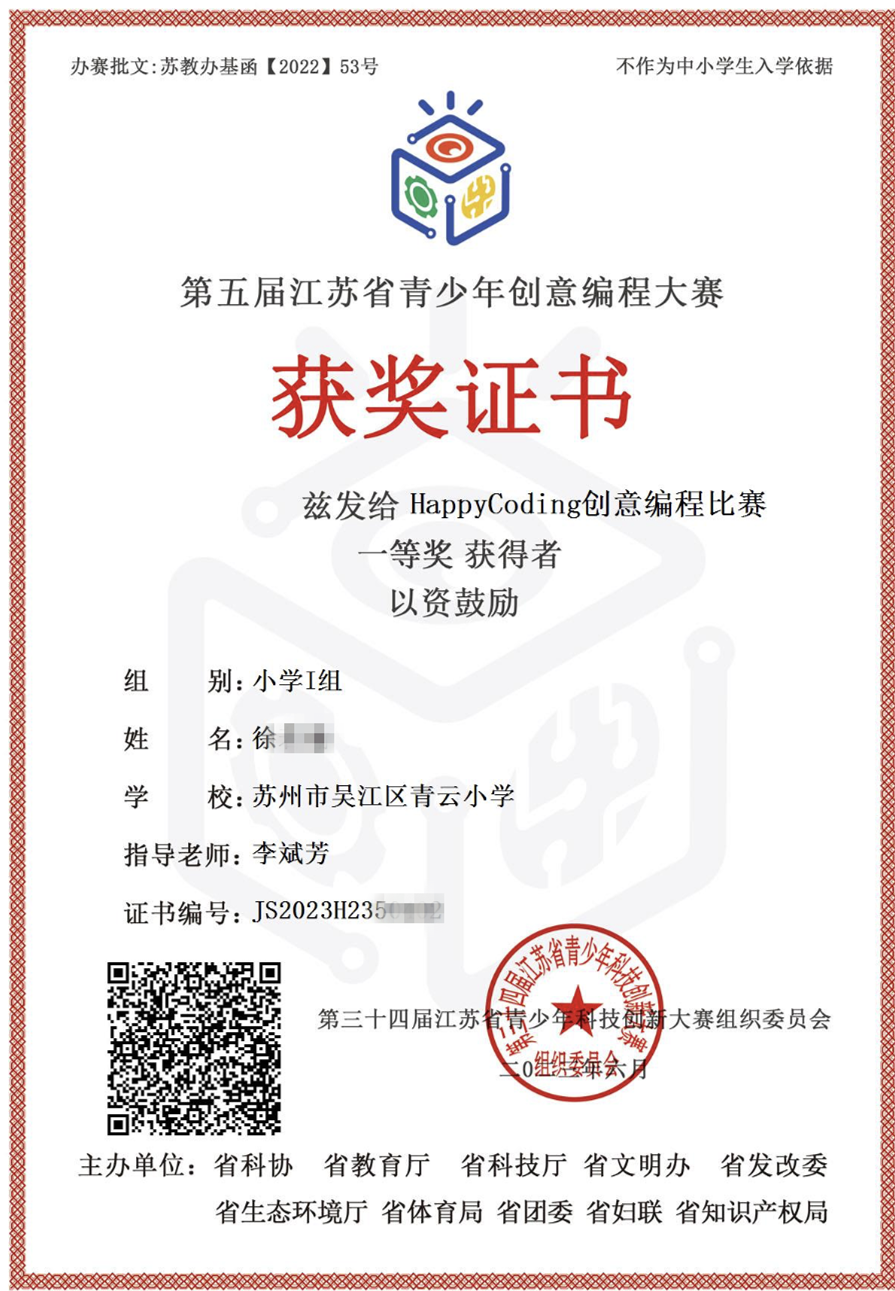 此前,該校還有學(xué)生取得2022-2023學(xué)年“全國(guó)中小學(xué)信息技術(shù)創(chuàng)新與實(shí)踐大賽”AI創(chuàng)想家賽項(xiàng)選拔賽小學(xué)高年級(jí)組一等獎(jiǎng),與第五屆江蘇省青少年創(chuàng)意編程大賽HappyCoding創(chuàng)意編程比賽小學(xué)Ⅰ組一等獎(jiǎng)的優(yōu)異成績(jī)。