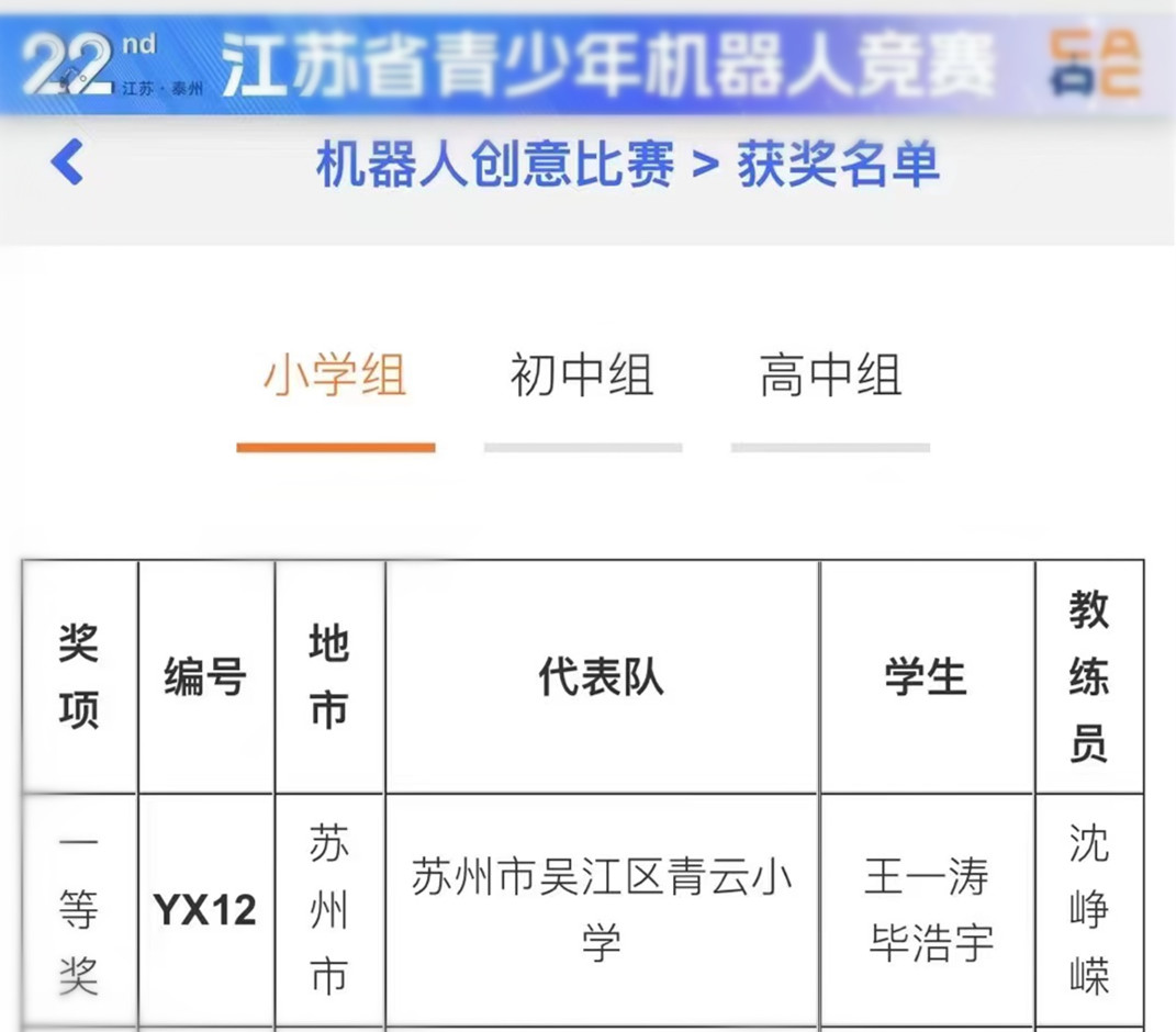 在本屆比賽中,來(lái)自蘇州市吳江區(qū)青云小學(xué)的兩位學(xué)生勇奪機(jī)器人創(chuàng)意比賽小學(xué)組一等獎(jiǎng)的佳績(jī)。青云小學(xué)代表隊(duì)也成為江蘇省唯一進(jìn)入國(guó)賽的代表隊(duì)。