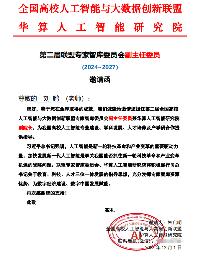 近日,劉鵬教授接受邀請(qǐng),將擔(dān)任第二屆全國高校人工智能與大數(shù)據(jù)創(chuàng)新聯(lián)盟專家智庫委員會(huì)副主任委員兼華算人工智能研究院副院長。
