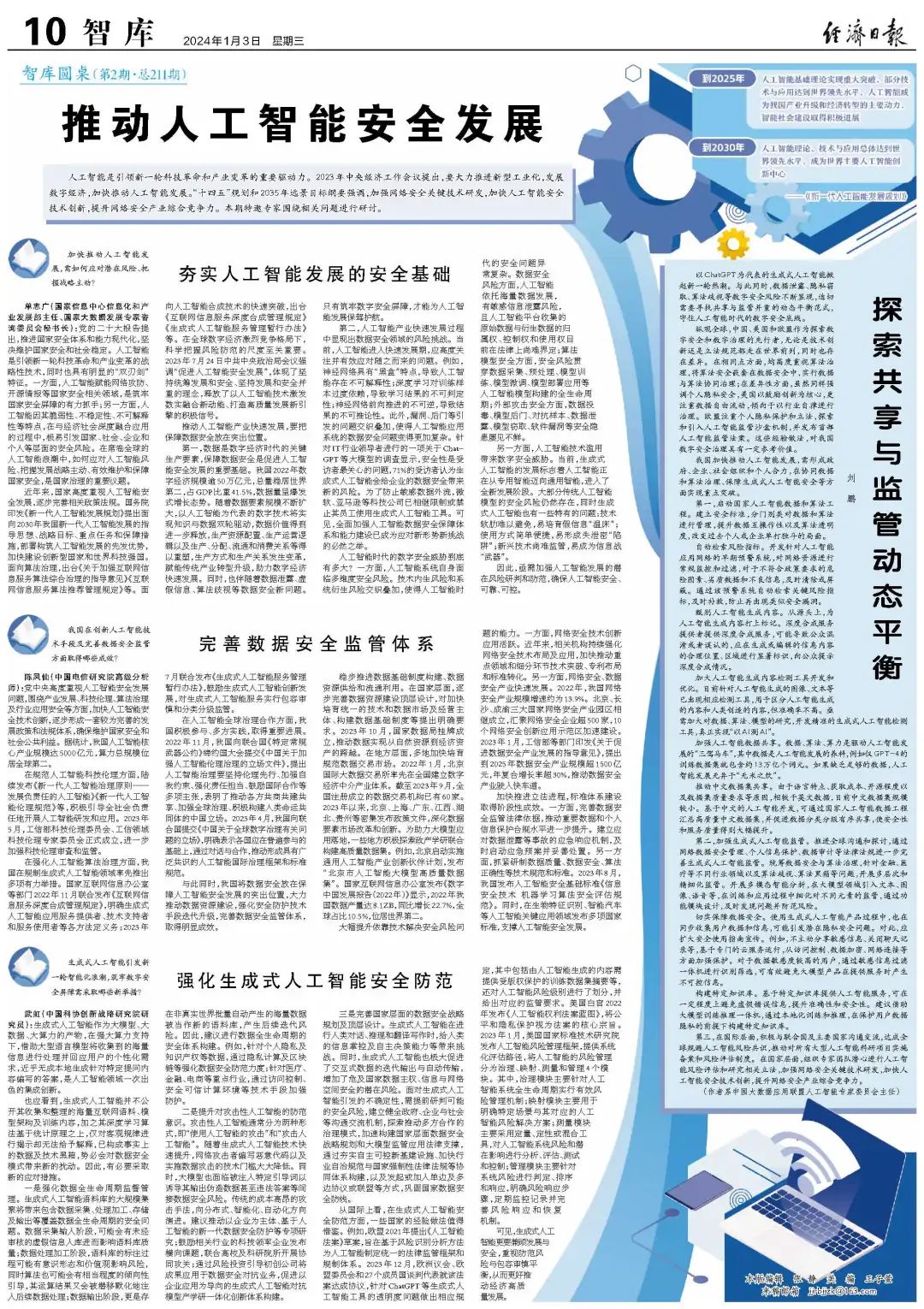 1月3日,中央直屬黨報(bào)《經(jīng)濟(jì)日?qǐng)?bào)》在10智庫(kù)版發(fā)表劉鵬教授署名文章《探索共享與監(jiān)管動(dòng)態(tài)平衡》。劉鵬教授與多位專家在該版面共同探討了“如何推動(dòng)人工智能安全發(fā)展”這一話題。