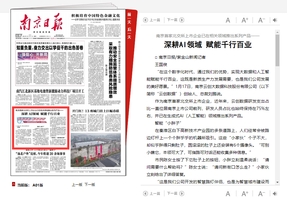 1月22日,《南京日報》在頭版以“深耕AI領(lǐng)域 賦能千行百業(yè)”為題,對云創(chuàng)大數(shù)據(jù)進行宣傳報道。全文對云創(chuàng)大數(shù)據(jù)在人工智能和大數(shù)據(jù)發(fā)展賽道上的亮眼成績和創(chuàng)新產(chǎn)品進行了介紹。