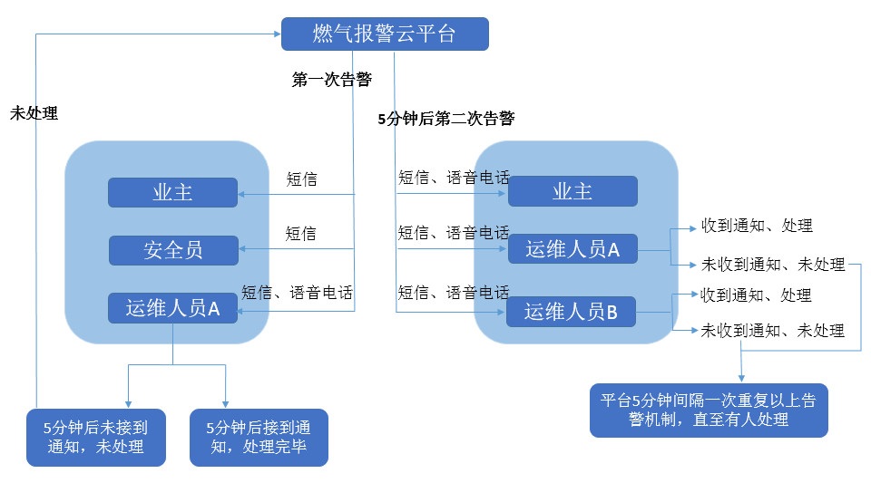 一般來說,按照報警流程,如果燃?xì)獍l(fā)生異常時,燃?xì)鈭缶破脚_會及時通知業(yè)主、街道安全員以及云創(chuàng)平臺運(yùn)維人員。運(yùn)維人員在收到短信通知后會及時打開手機(jī)APP,查看報警日志,并對異常事件進(jìn)行持續(xù)跟蹤。如果聯(lián)系不到業(yè)主,運(yùn)維人員會及時前往現(xiàn)場,進(jìn)行現(xiàn)場的檢測和排查。