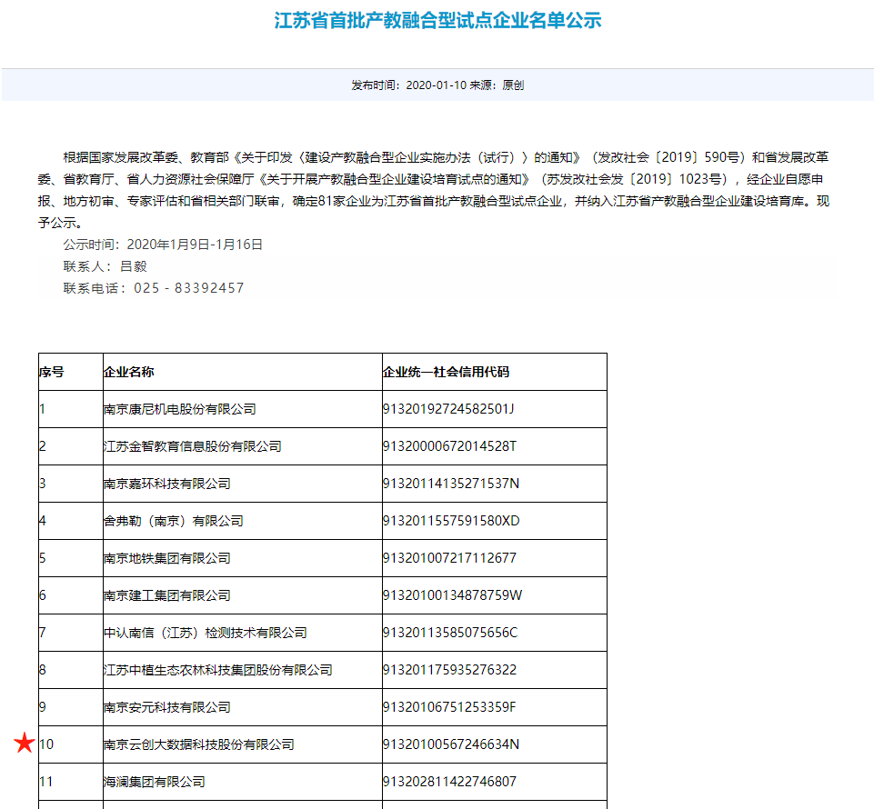 日前,江蘇省發(fā)改委發(fā)布信息,根據國家發(fā)展改革委、教育部《關于印發(fā)〈建設產教融合型企業(yè)實施辦法(試行)〉的通知》(發(fā)改社會〔2019〕590號)和省發(fā)展改革委、省教育廳、省人力資源社會保障廳《關于開展產教融合型企業(yè)建設培育試點的通知》(蘇發(fā)改社會發(fā)〔2019〕1023號),經企業(yè)自愿申報、地方初審、專家評估和省相關部門聯(lián)審,確定了江蘇省首批產教融合型試點企業(yè),并納入江蘇省產教融合型企業(yè)建設培育庫。其中,南京云創(chuàng)大數據科技股份有限公司榜上有名。