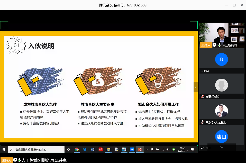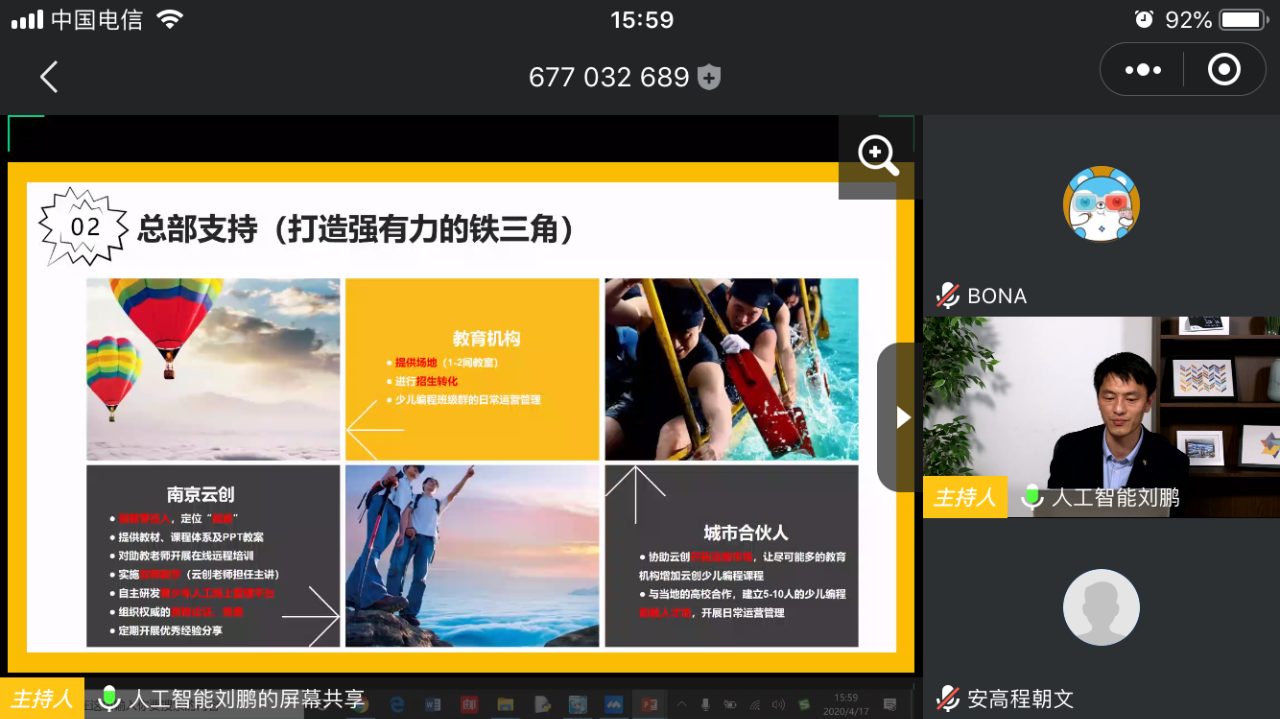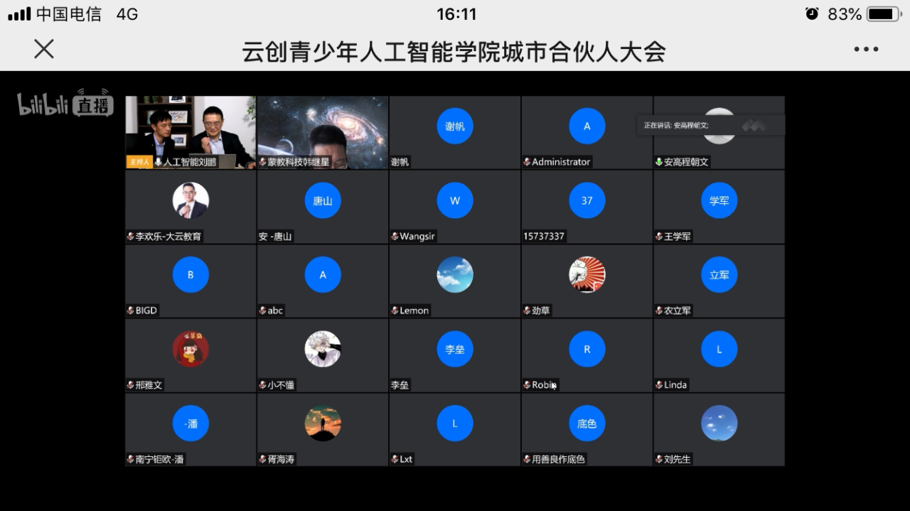 在與城市合伙人代表交流互動(dòng)環(huán)節(jié),劉鵬教授、湯鵬經(jīng)理在直播間回答了參會(huì)代表的相關(guān)疑問(wèn)。大家結(jié)合自己所在城市、培訓(xùn)機(jī)構(gòu)或企業(yè)的實(shí)際情況,就市場(chǎng)前景、合作模式等與云創(chuàng)方面進(jìn)行了交流,為此大家也堅(jiān)定了成為云創(chuàng)青少年人工智能學(xué)院合伙人的信心。