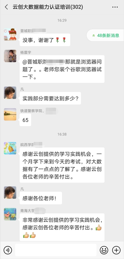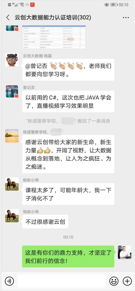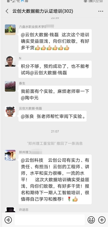 培訓(xùn)結(jié)束后,參訓(xùn)學(xué)員紛紛反饋課程干貨很多,自己受益匪淺,給他們從事大數(shù)據(jù)教學(xué)以及人才培養(yǎng)帶去了很多啟發(fā)。同時(shí),云創(chuàng)大數(shù)據(jù)的實(shí)力和擔(dān)當(dāng)也收獲大家的不俗評(píng)價(jià)。此外,對(duì)于能夠提供這樣一個(gè)難得機(jī)會(huì)的劉鵬教授和云創(chuàng)大數(shù)據(jù),學(xué)員們也表示非常感謝,并對(duì)講師團(tuán)隊(duì)的悉心指導(dǎo)給予了高度好評(píng)!值得一提的是,更有學(xué)員對(duì)云創(chuàng)將要舉辦的人工智能能力認(rèn)證(中級(jí))培訓(xùn)充滿期待。