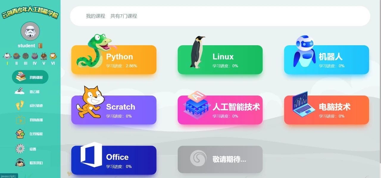 云創(chuàng)青少年人工智能學(xué)院課程根據(jù)孩子水平設(shè)計了科學(xué)完善的課程體系,從入門到進階技能,課程體系不斷延伸,讓孩子由淺入深,不斷適應(yīng)編程教學(xué),解決了少兒編程課程痛點。