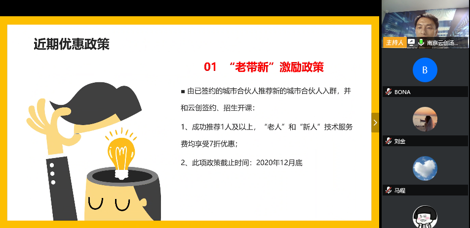 為了進(jìn)一步拓展合作規(guī)模,使更多合伙人能夠在全國各個城市推進(jìn)云創(chuàng)青少年人工智能學(xué)院成熟的商業(yè)模式,9月22日下午,云創(chuàng)大數(shù)據(jù)在騰訊會議線上舉辦了云創(chuàng)青少年人工智能學(xué)院城市合伙人大會,現(xiàn)有城市合伙人和有意向成為城市合伙人的行業(yè)同仁蒞臨參會。