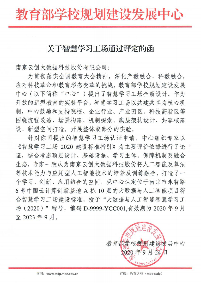 日前,規(guī)建中心組織專家以《智慧學(xué)習(xí)工場(chǎng)2020建設(shè)標(biāo)準(zhǔn)指引》為主要評(píng)價(jià)依據(jù)對(duì)南京云創(chuàng)大數(shù)據(jù)科技股份有限公司(以下簡(jiǎn)稱“云創(chuàng)大數(shù)據(jù)”)進(jìn)行了論證,并綜合考慮頂層設(shè)計(jì)、基礎(chǔ)設(shè)施、學(xué)習(xí)主體、保障機(jī)制及融合生態(tài),專家一致認(rèn)為云創(chuàng)大數(shù)據(jù)將人工智能及算法等技術(shù)能力與應(yīng)用型人工智能技術(shù)的培養(yǎng)及訓(xùn)練融合,打造了一個(gè)學(xué)習(xí)、創(chuàng)新、應(yīng)用結(jié)合的空間。規(guī)建中心認(rèn)定云創(chuàng)大數(shù)據(jù)的大數(shù)據(jù)與人工智能項(xiàng)目符合智慧學(xué)習(xí)工場(chǎng)建設(shè)標(biāo)準(zhǔn),并授予了“大數(shù)據(jù)與人工智能智慧學(xué)習(xí)工場(chǎng)(2020)”稱號(hào),編碼D-9999-YCC001,有效期為2020年9月至2023年9月。