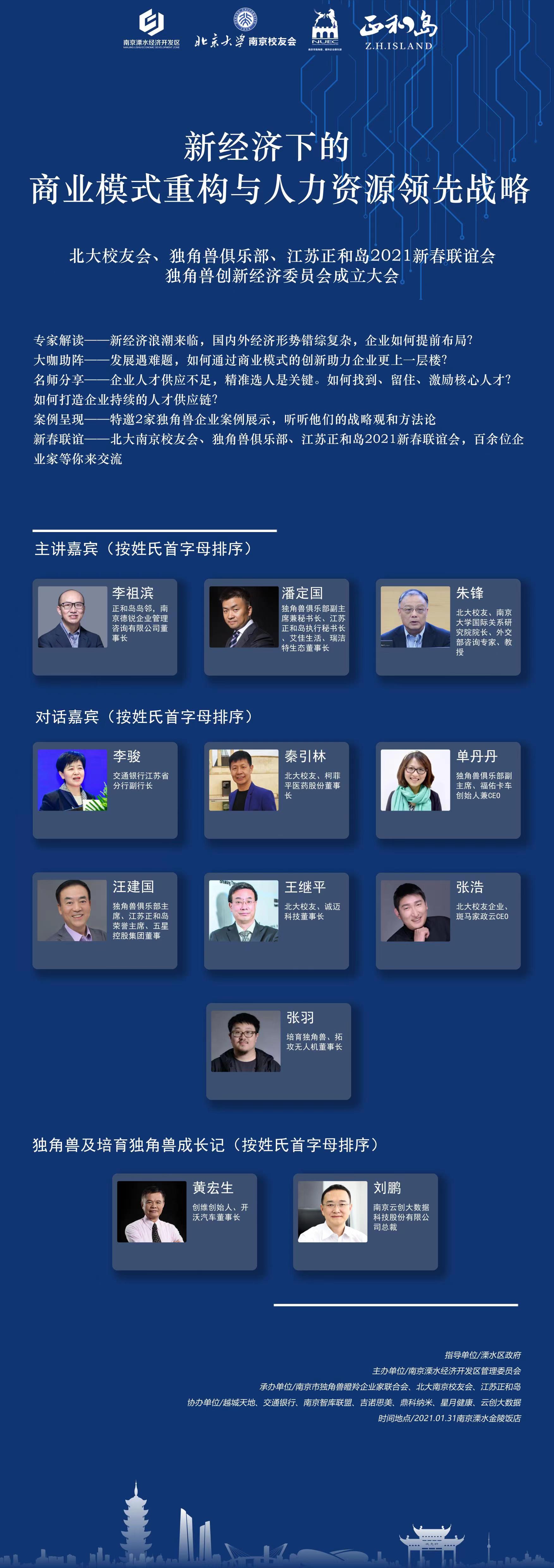 為進一步應對新冠肺炎疫情對我國經(jīng)濟的沖擊,尋求“不確定因素”下企業(yè)發(fā)展的新路徑,加速推動一大批高成長性獨角獸企業(yè)從新經(jīng)濟的浪潮里脫穎而出,1月31日,北大校友會、獨角獸俱樂部、江蘇正和島2021新春聯(lián)誼會暨獨角獸創(chuàng)新經(jīng)濟委員會成立大會在南京溧水金陵飯店舉辦。與會嘉賓齊聚一堂,共話發(fā)展,共謀機遇。