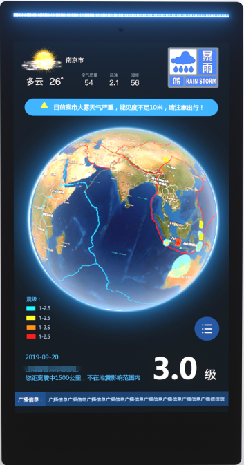 智慧信息屏集成了地震預警、氣象預警、防洪防汛預警、地質(zhì)災害預警以及地震烈度速報的應(yīng)急信息發(fā)布終端。通過紅、橙、黃、藍四色燈光及聲音進行應(yīng)急預警,并通過內(nèi)置三軸加速度傳感器記錄震時震感數(shù)據(jù)、內(nèi)置高清攝像頭采集地震現(xiàn)場災情。該產(chǎn)品還能通過設(shè)備位置、人臉識別實現(xiàn)定點精確推送,并提供內(nèi)容發(fā)布、新聞推送、交通實況、生活指數(shù)等諸多智慧服務(wù)功能。