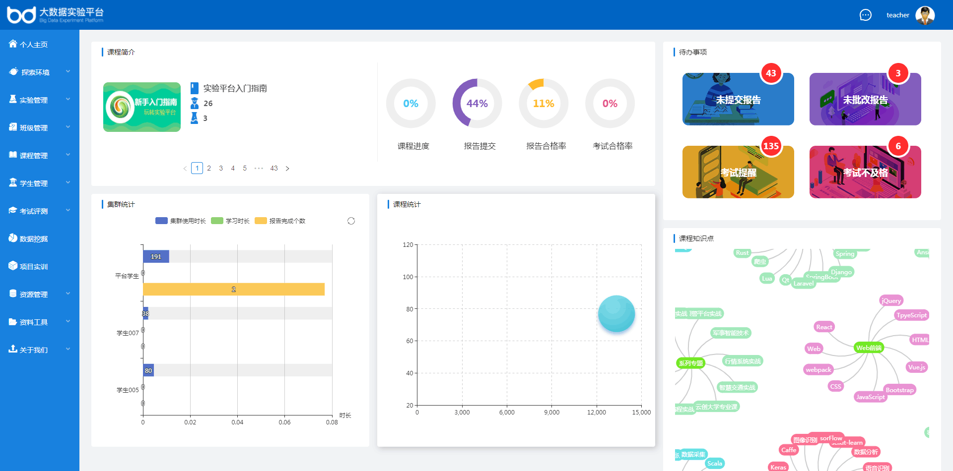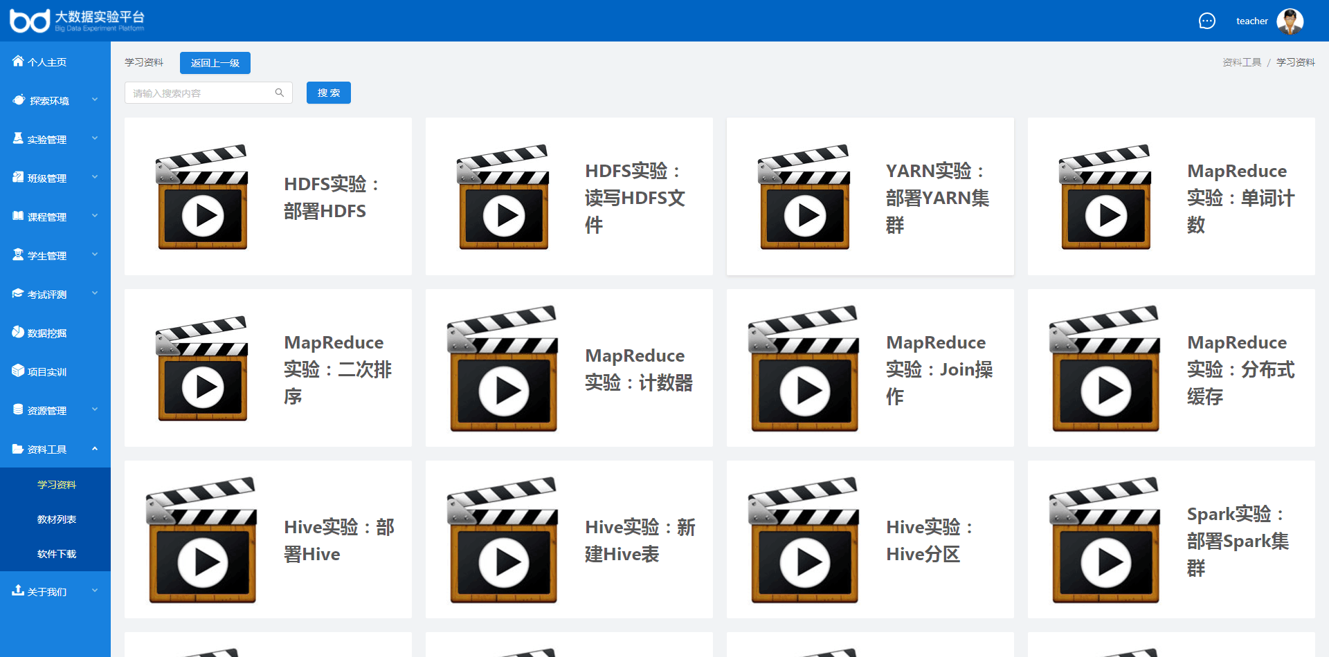 針對(duì)全國大數(shù)據(jù)專業(yè)人才的培養(yǎng),云創(chuàng)BDRack大數(shù)據(jù)實(shí)驗(yàn)平臺(tái)(目前實(shí)驗(yàn)總數(shù)為424個(gè))基于Docker容器技術(shù),一鍵創(chuàng)建實(shí)驗(yàn)環(huán)境,支持多人同時(shí)在線,實(shí)驗(yàn)相互隔離、互不干擾,集成考試系統(tǒng)(包括試題庫)與數(shù)據(jù)可視化應(yīng)用,同步提供詳實(shí)的實(shí)驗(yàn)手冊(cè)、實(shí)驗(yàn)視頻、教學(xué)課件等資源,更好地滿足課程設(shè)計(jì)、課程上機(jī)實(shí)驗(yàn)、實(shí)習(xí)實(shí)訓(xùn)、科研訓(xùn)練等需求。