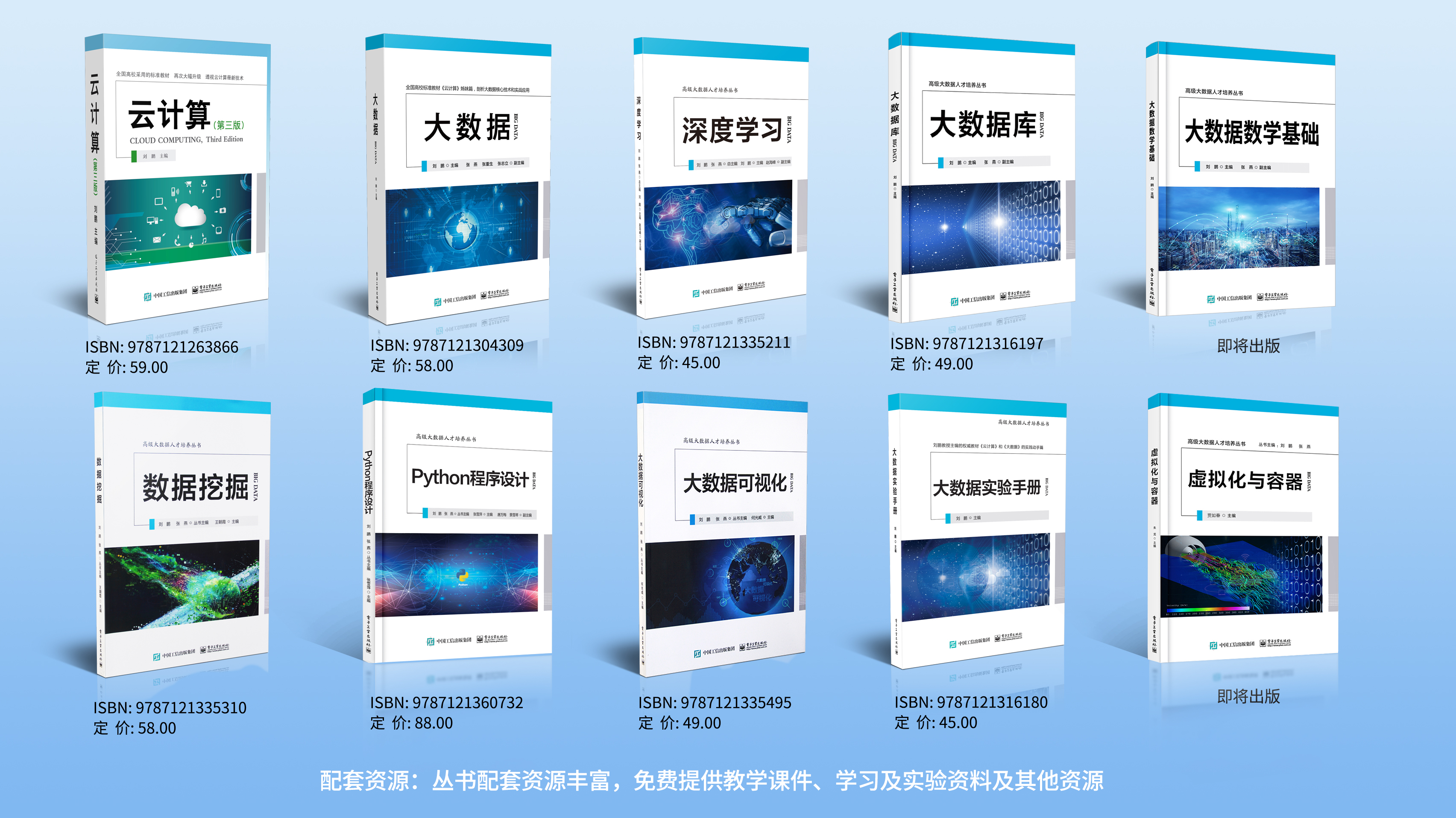 具體而言,該叢書包含《云計算》、《大數(shù)據(jù)》、《深度學(xué)習(xí)》、《大數(shù)據(jù)庫》、《大數(shù)據(jù)數(shù)學(xué)基礎(chǔ)》、《數(shù)據(jù)挖掘》、《Python程序設(shè)計》、《大數(shù)據(jù)可視化》、《大數(shù)據(jù)實驗手冊》、《虛擬化與容器》。其中,《云計算》已經(jīng)更新到第三版,且長年名列中國計算機(jī)圖書被引用量前列,據(jù)知網(wǎng)評價微信公眾號(微信號:cnkipj)《【 《【工學(xué)】高被引圖書前三甲,你讀過嗎?》 報道,2010年至2014年《云計算》位居中國高被引圖書自動化技術(shù)、計算機(jī)技術(shù)類別第一名。