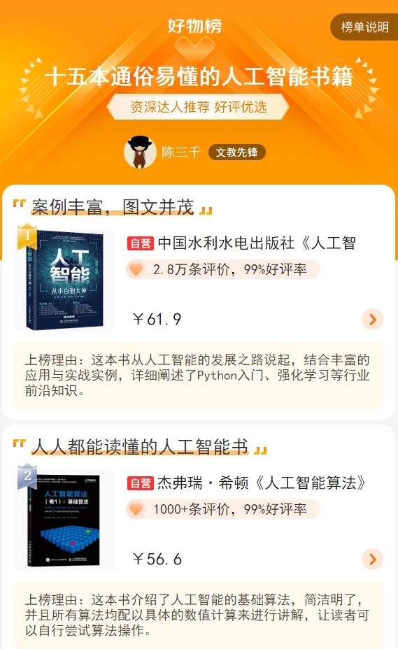 自出版以來,《人工智能——從小白到大神》以“案例豐富,圖文并茂”吸引了廣大讀者,好評(píng)飆升,在京東自營(yíng)店達(dá)到“2.8萬(wàn)條評(píng)價(jià),99%好評(píng)率”,被京東“十五本通俗易懂的人工智能書籍”好物榜單置頂。