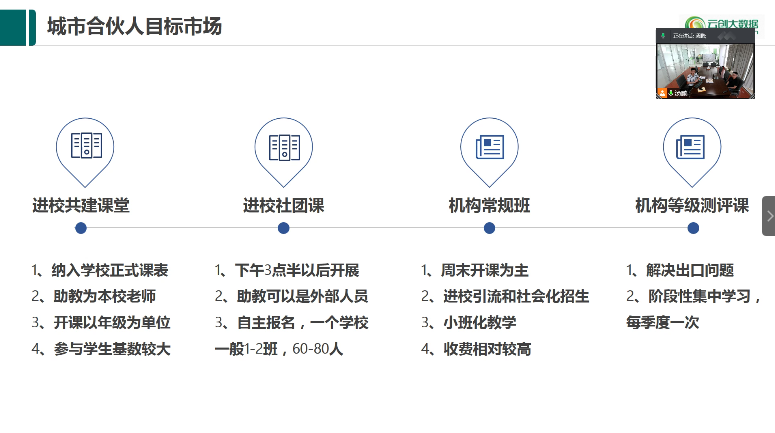 稍后,湯鵬經(jīng)理帶來了云創(chuàng)青少年人工智能編程城市合伙人合作政策及商務(wù)模式方面的介紹,并圍繞“角色定位”、“目標(biāo)市場”、“產(chǎn)品定價(jià)”等方面帶來了詳盡分享。湯鵬經(jīng)理提及,進(jìn)校共建課堂、進(jìn)校社團(tuán)課、機(jī)構(gòu)常規(guī)班以及機(jī)構(gòu)等級(jí)測評(píng)課都是城市合伙人的目標(biāo)市場所在。