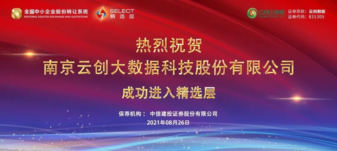 8月26日,南京云創(chuàng)大數(shù)據(jù)科技股份有限公司(股票簡稱:云創(chuàng)數(shù)據(jù),股票代碼:835305,公司簡稱:云創(chuàng)大數(shù)據(jù))成功進(jìn)入全國股轉(zhuǎn)系統(tǒng)精選層掛牌。這是云創(chuàng)大數(shù)據(jù)繼2015年掛牌新三板,2020年進(jìn)入創(chuàng)新層以來的又一里程碑事件。云創(chuàng)大數(shù)據(jù)也成為南京第一家精選層掛牌公司。