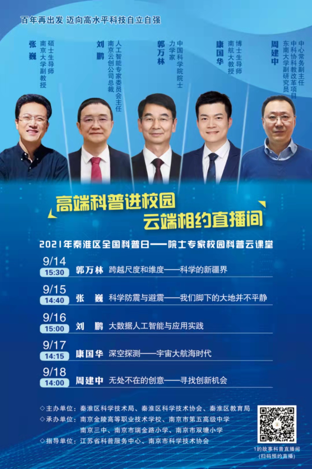 9月14日-18日,2021年秦淮區(qū)全國科普日——院士專家校園科普云課堂系列活動將連續(xù)舉辦5場?;顒釉诮K省科普服務中心、南京市科學技術協會指導下,由秦淮區(qū)科學技術局、區(qū)科學技術協會、區(qū)教育局主辦?;顒又荚谙蚬姺窒砜茖W家精神,幫助青少年領會科技魅力,在實踐中體驗科技知識,真正實現各項科普活動惠及于民、方便于民,真正讓大眾走進科學、體驗科學、愛上科學。