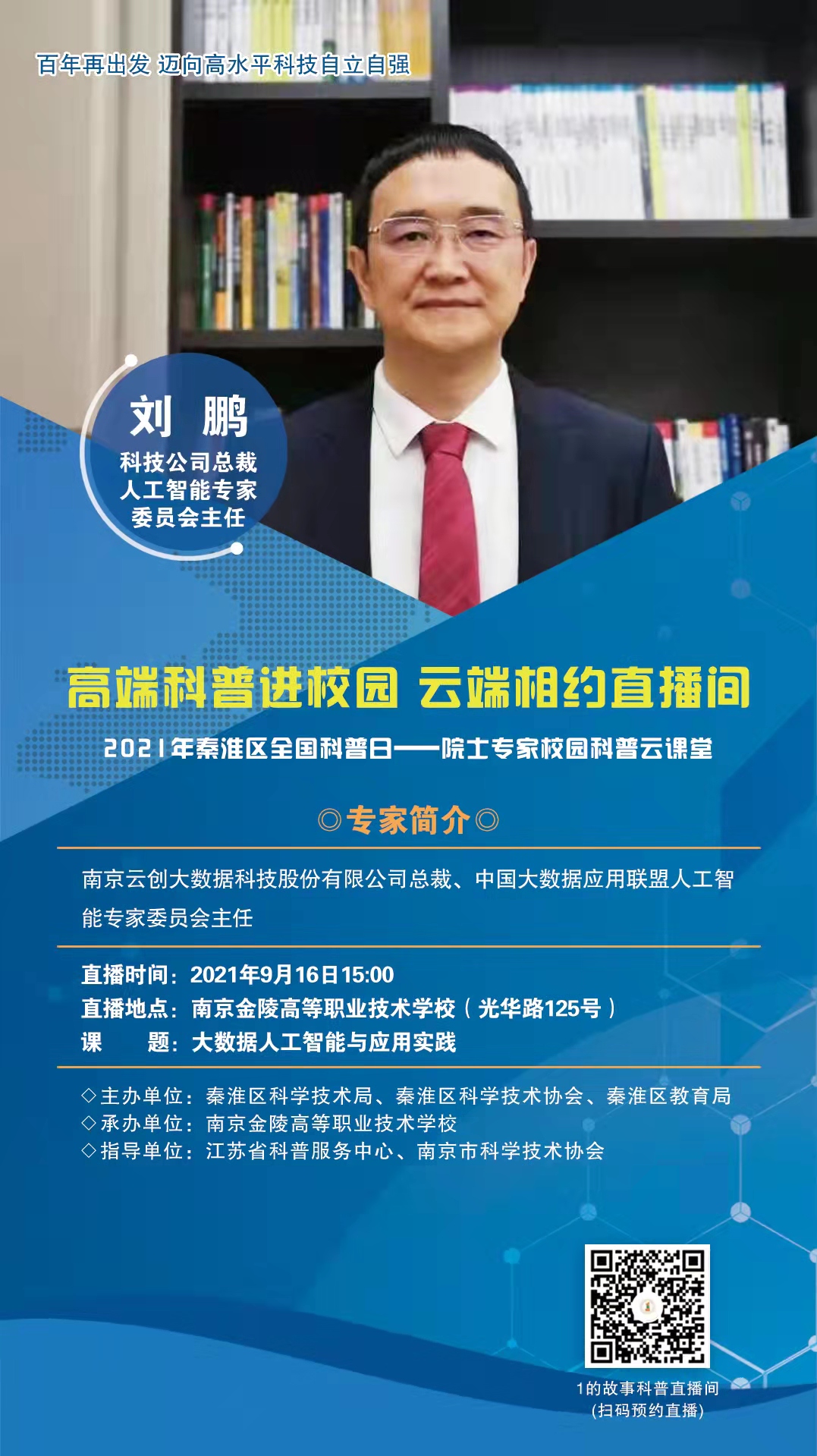 9月16日下午3點,以“高端科普進校園 云端相約直播間”為主題的2021年秦淮區(qū)全國科普日——院士專家校園科普第三場云課堂如期開課。劉鵬教授為大家?guī)砹恕按髷祿斯ぶ悄芘c應用實踐”主題報告。
