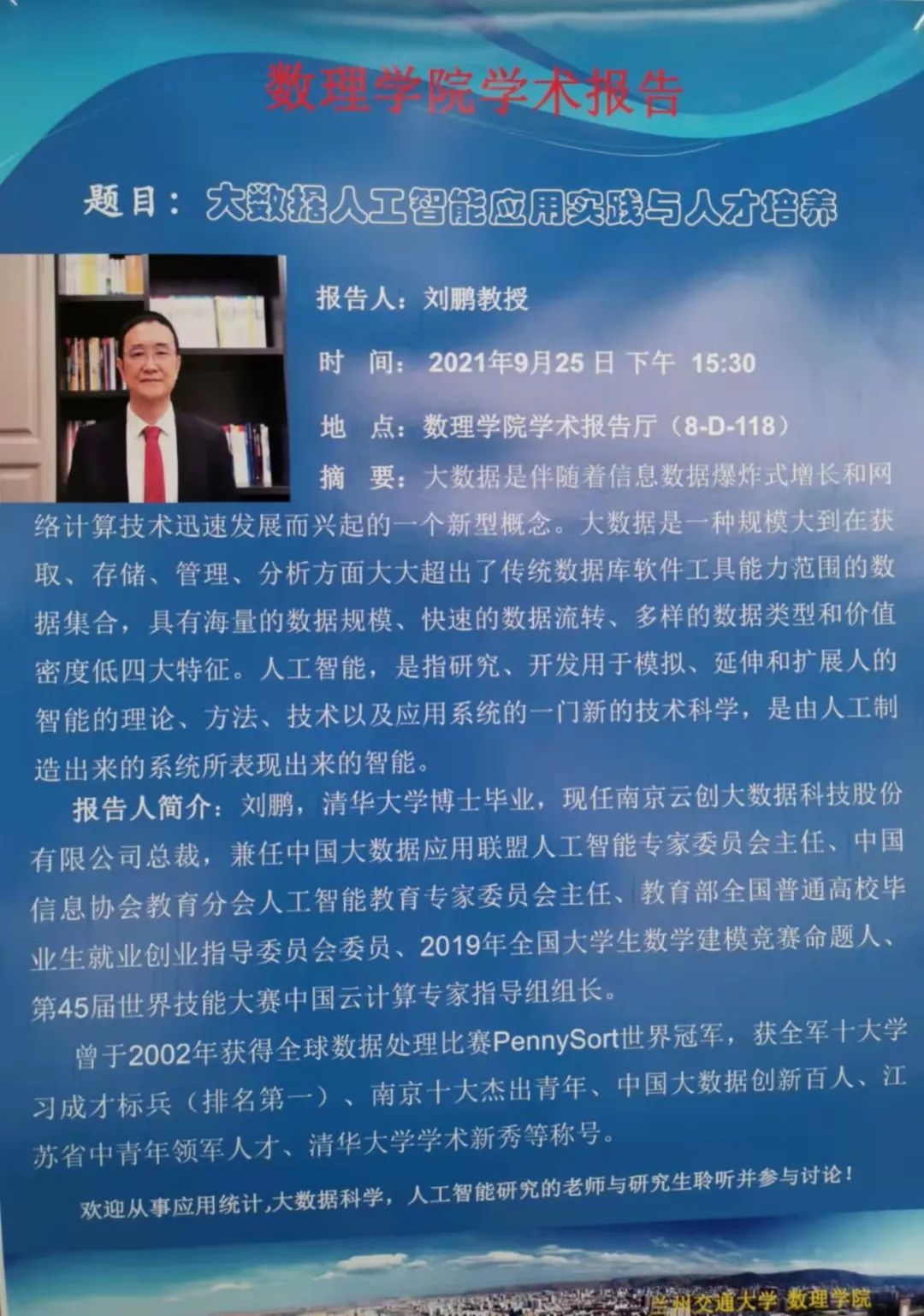 9月25日下午,劉鵬教授受邀在蘭州交通大學(xué)數(shù)理學(xué)院作主題為《大數(shù)據(jù)人工智能應(yīng)用實踐與人才培養(yǎng)》的報告,應(yīng)用統(tǒng)計、大數(shù)據(jù)科學(xué)、人工智能研究方向的師生們參加了本次報告會。