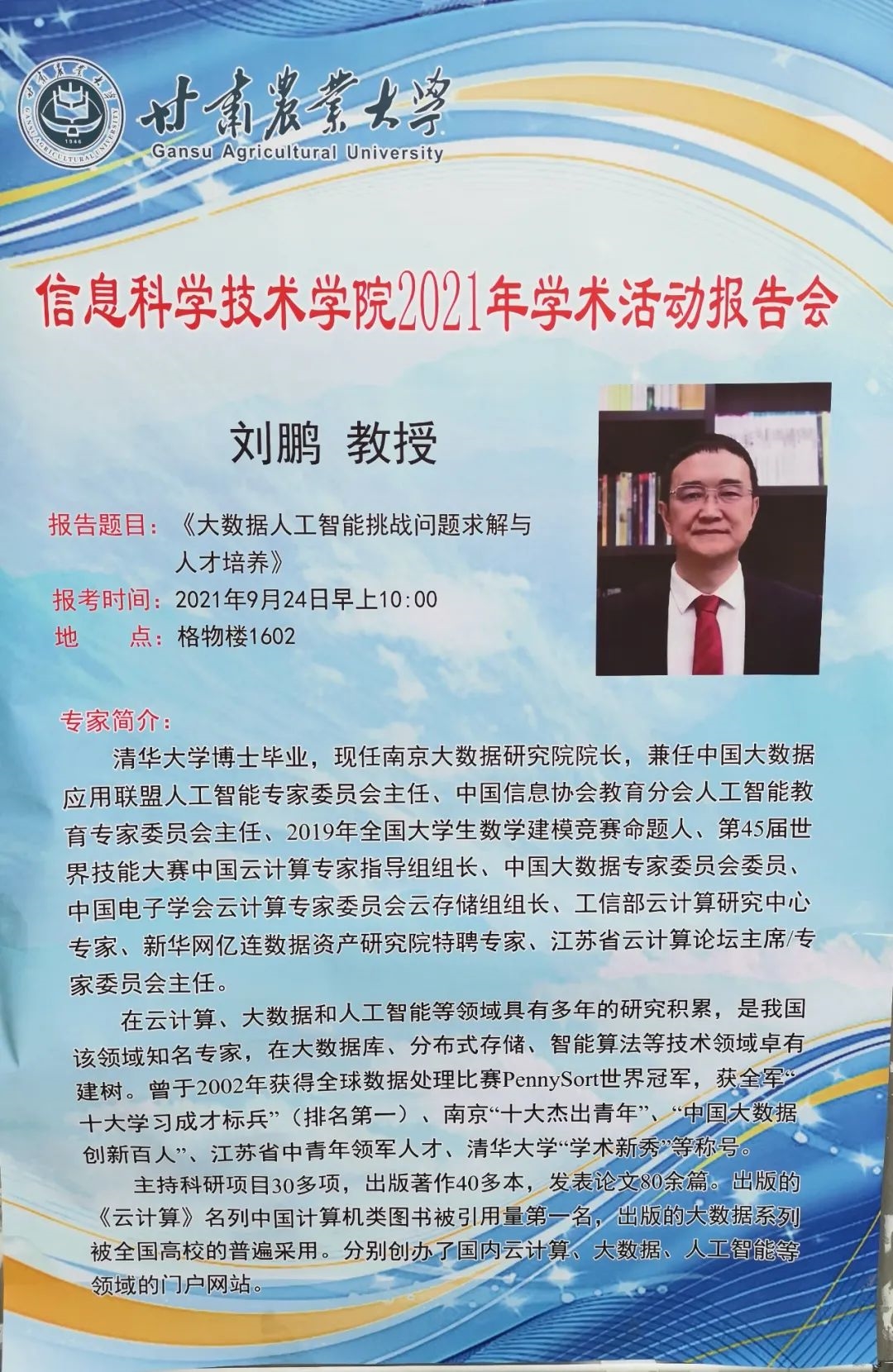 9月24日上午,劉鵬教授受邀在甘肅農(nóng)業(yè)大學(xué)信息科學(xué)技術(shù)學(xué)院2021年學(xué)術(shù)活動報告會作主題為《大數(shù)據(jù)人工智能應(yīng)用實踐與人才培養(yǎng)》的報告??盗④娫洪L與一眾師生參加了本次報告會。