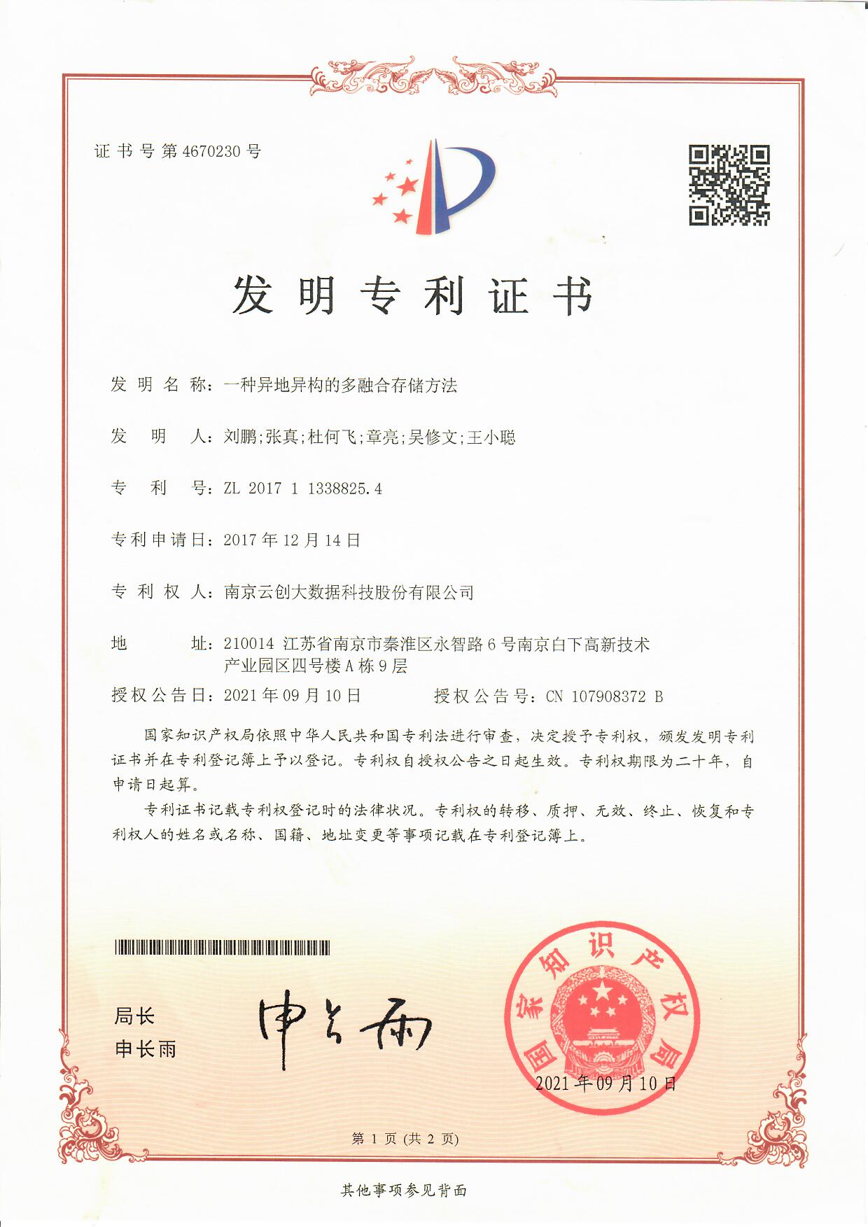 近日,南京云創(chuàng)大數(shù)據(jù)科技股份有限公司(簡稱“云創(chuàng)大數(shù)據(jù)”)在云存儲領(lǐng)域的研發(fā)成果再獲國家發(fā)明專利。其申請的“一種異地異構(gòu)的多融合存儲方法”獲得了國家知識產(chǎn)權(quán)局頒發(fā)的發(fā)明專利證書。這體現(xiàn)了云創(chuàng)取得的獨立知識產(chǎn)權(quán)成果再次得到權(quán)威的認(rèn)可和肯定。