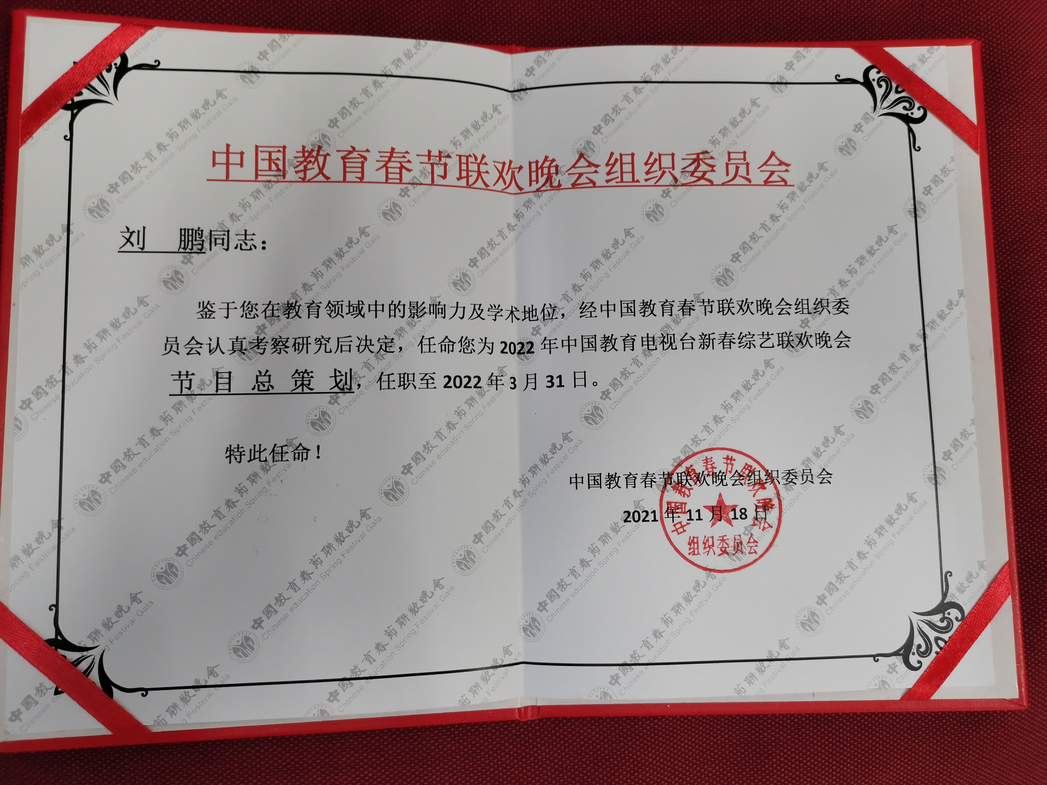 近日,經(jīng)中國(guó)教育春節(jié)聯(lián)歡晚會(huì)組織委員會(huì)研究決定,劉鵬教授受聘為2022年中國(guó)教育電視臺(tái)新春綜藝聯(lián)歡晚會(huì)節(jié)目總策劃。
