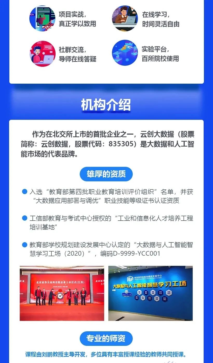 云創(chuàng)智學(xué)提供云計算、大數(shù)據(jù)、人工智能在線課程,配套真實的大數(shù)據(jù)集群開發(fā)環(huán)境,讓大家在學(xué)習(xí)中積累實戰(zhàn)?經(jīng)驗,以更好地適應(yīng)職場需求。
