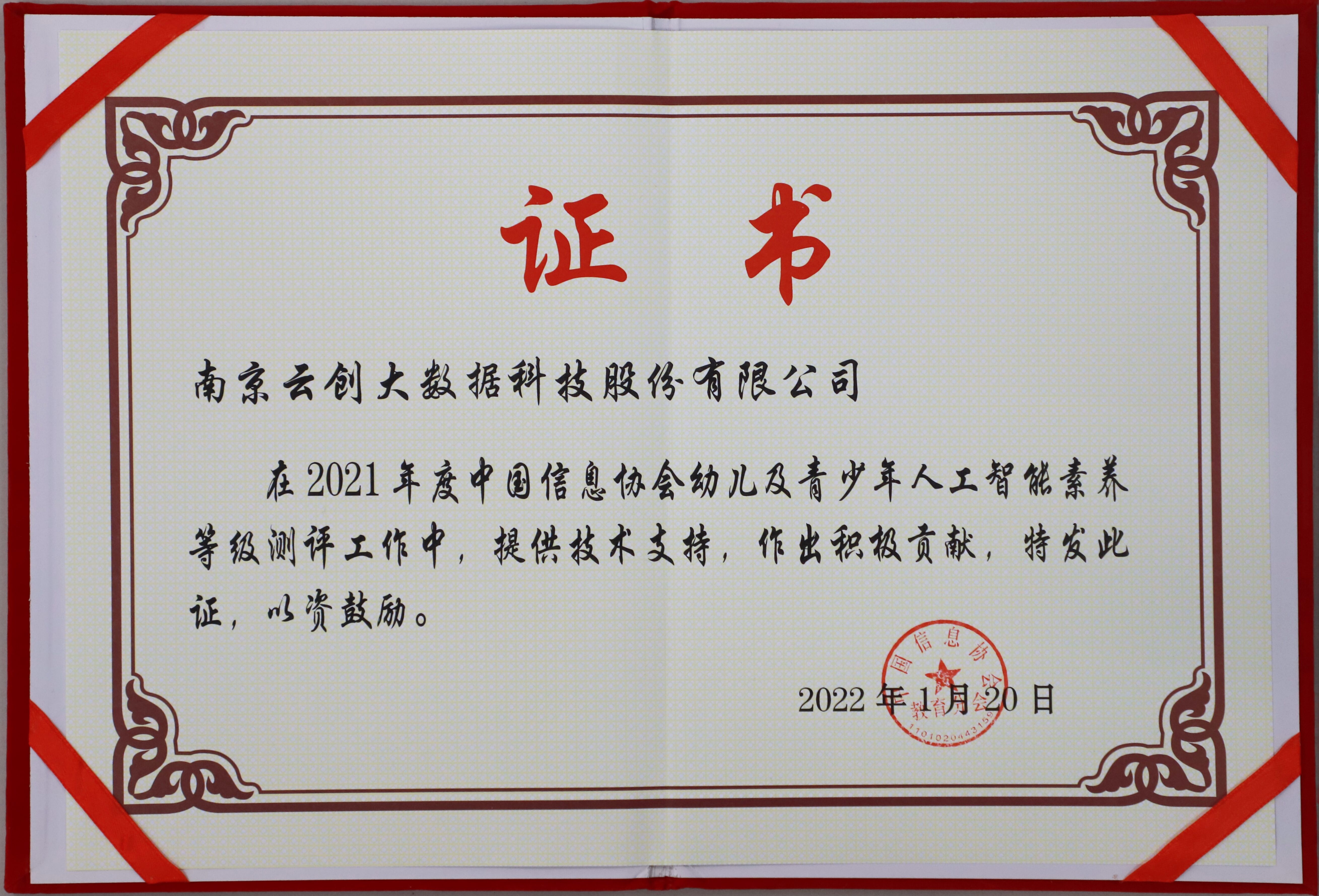 值得一提的是,云創(chuàng)大數(shù)據(jù)憑借為2021年度幼兒及青少年人工智能素養(yǎng)等級測評工作提供的技術(shù)支持和作出的積極貢獻,被中國信息協(xié)會教育分會授予表彰證書。